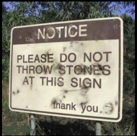위 사인에는 '돌을 이 표지판에 던지지 마세요, 감사합니다.'라고 써있다.