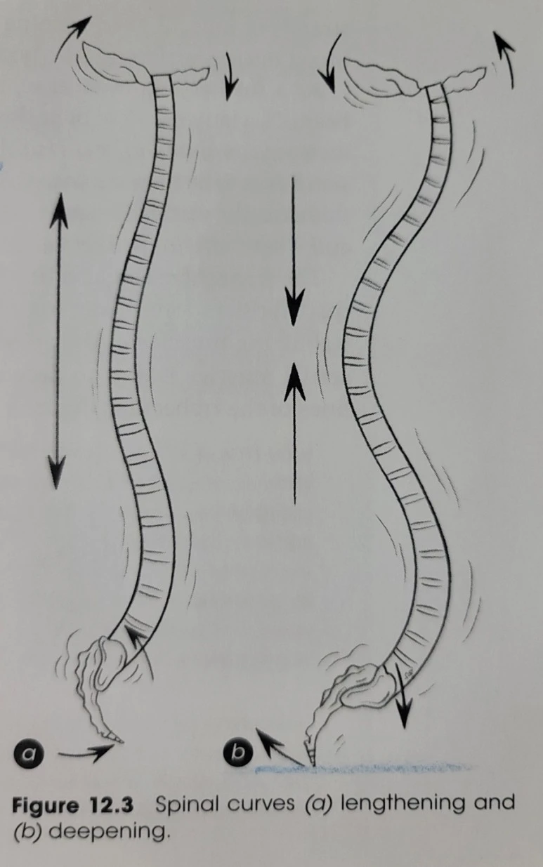 선 채로 발을 지면에 디디고 무릎을 접는 자세를 취해 볼까요?이 때 척추의 커브는 깊어지게 되고(deepening) 무릎을 펴고 서게 되면 척추의 굴곡은 완만하고 길어집니다.(lengthening)