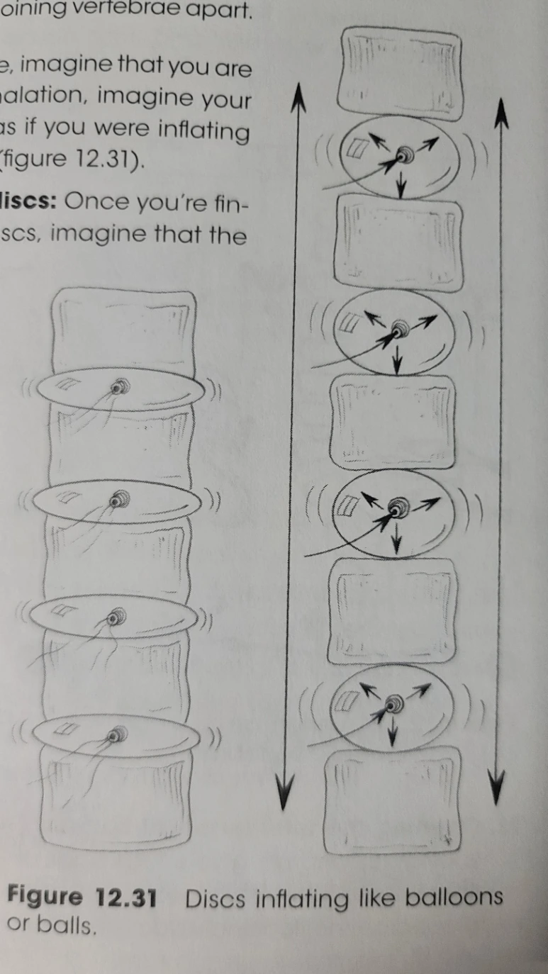 척추의 커브와 별개로 호흡을 하면서 디스크의 움직임만 떠올려 보는 것도 도움이 되요. 이번에는 반대로 호흡을 마실 때 풍선처럼 추체 사이 사이 공간이 부풀고 호흡을 내 쉴 때 풍선 바람 빠지듯 납작해지는 느낌을 떠올려 보세요. [그림 2 참조 Disc inflating like balloons]