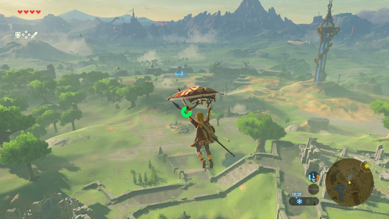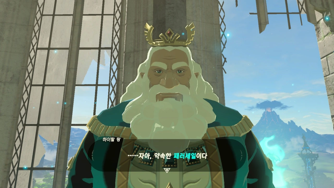 쌍둥이산? 카카리코? 왜 이렇게 지명이 낯설담... 왕이 가리키는 손 끝에는 양쪽으로 비슷하게 생긴 산이 나란히 서 있는, 다소 특이한 지형이 보였다. 산의 모양을 확인하는데, 노인, 아니 하이랄 왕이 나를 다시 쳐다보았다. 그는 이제 약속했던 패러세일을 내게 건네주었다.