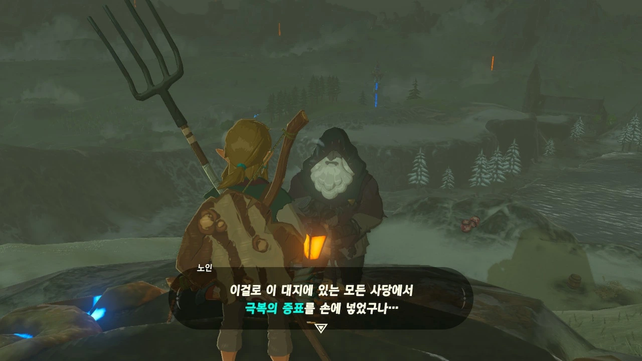 그의 목소리가 점점 멀어졌다. 노인이 나를 다시 바라보는데, 그의 몸 주변에 파란 기운이 돌았다. 푸른 불꽃들이 일어나더니 사라지며 그도 어느 새 자취를 감추었다. 그 노인은 사람이 아닌 귀신인가? 눈 앞에서 벌어진 일을 믿을 수가 없어 사당 주변을 돌며 혹시 노인이 있는 것은 아닌가 찾아보았다. 그러나 그는 없었다. 저 멀리 보이는 하이랄의 풍경도 딴 세상의 모습 같다.