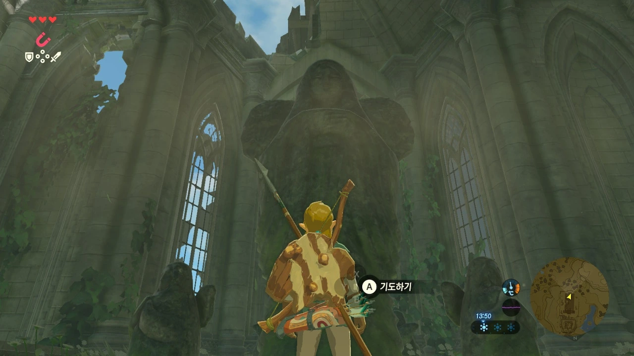 작은 여신상들에게 둘러싸여 있는 커다란 여신상 앞에 섰더니 기도를 할 수 있게 되었다. 무슨 기도를 하라는 것일까... 내가 하이랄 사람이라면, 분명 이전에도 기도를 했겠지? 하지만 어떻게 기도를 할 지 전혀 생각이 나지 않았다. 신성해 보이는 빛을 느끼며, 나는 그냥 마음으로 하일리아 여신을 불러보기로 했다.