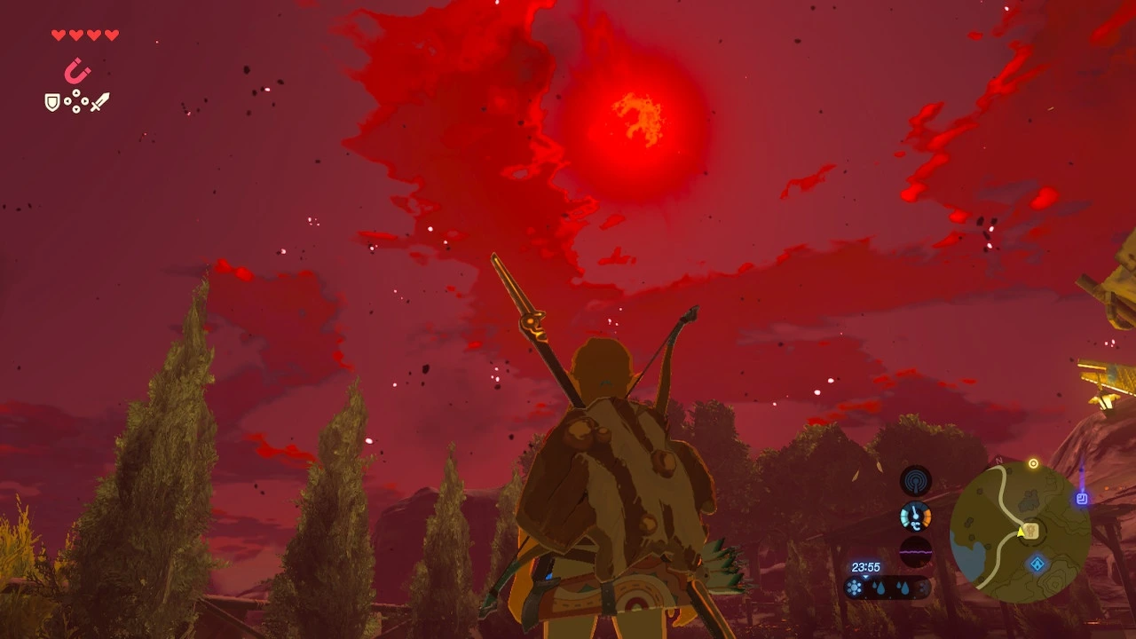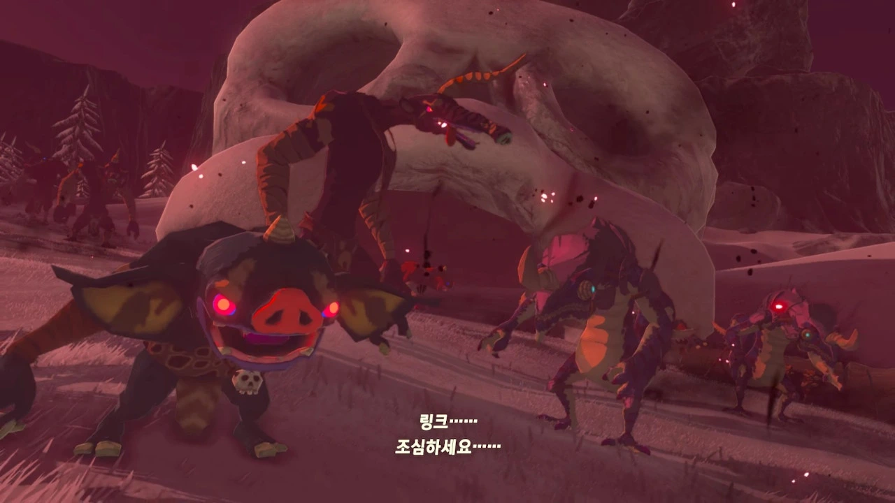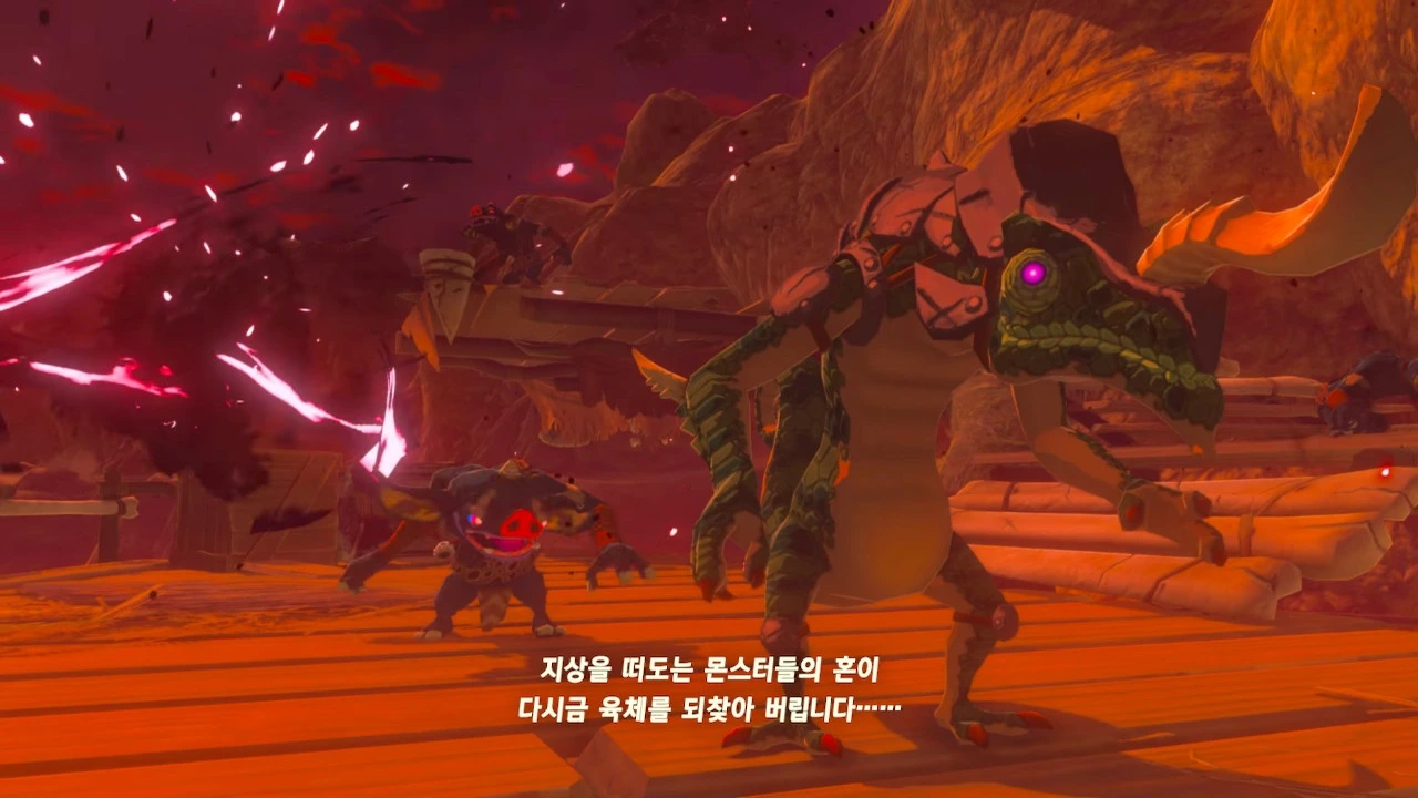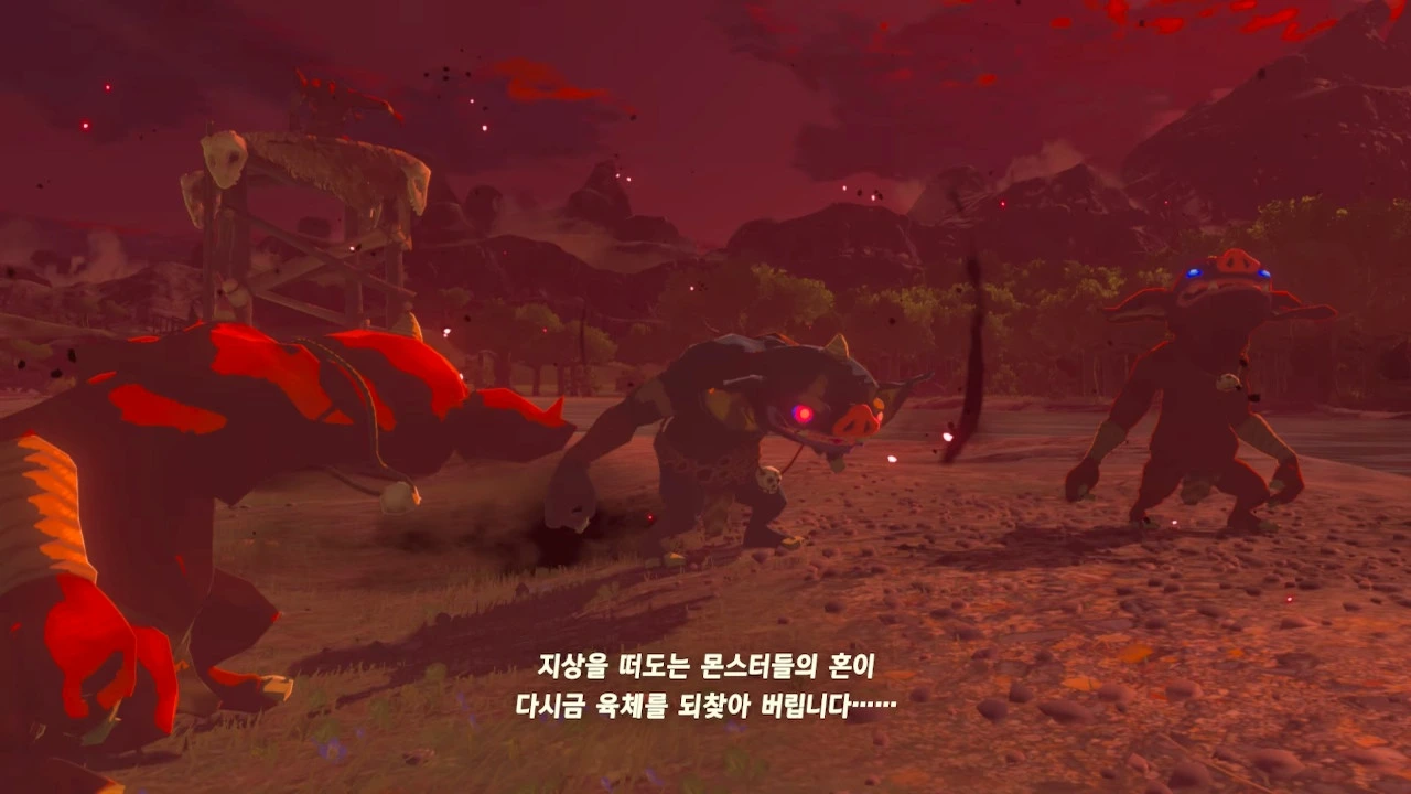 그녀의 목소리가 잘 들리지 않아 집중하려고 눈을 감았다. 그러나 눈을 감았는데도 내 눈 앞에는 하이랄 전역이 붉은 빛에 물들며 붉은 달의 기운이 퍼지는 모습이 보였다. 놀랍게도 내가 몬스터를 쓰러뜨렸던 장소에 다시 몬스터들이 되살아나는 모습이 보였다! 곧 그녀의 근심 가득한 목소리가 또렷이 들렸다.