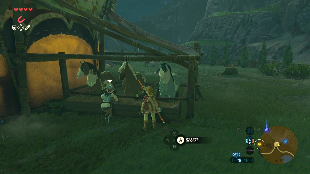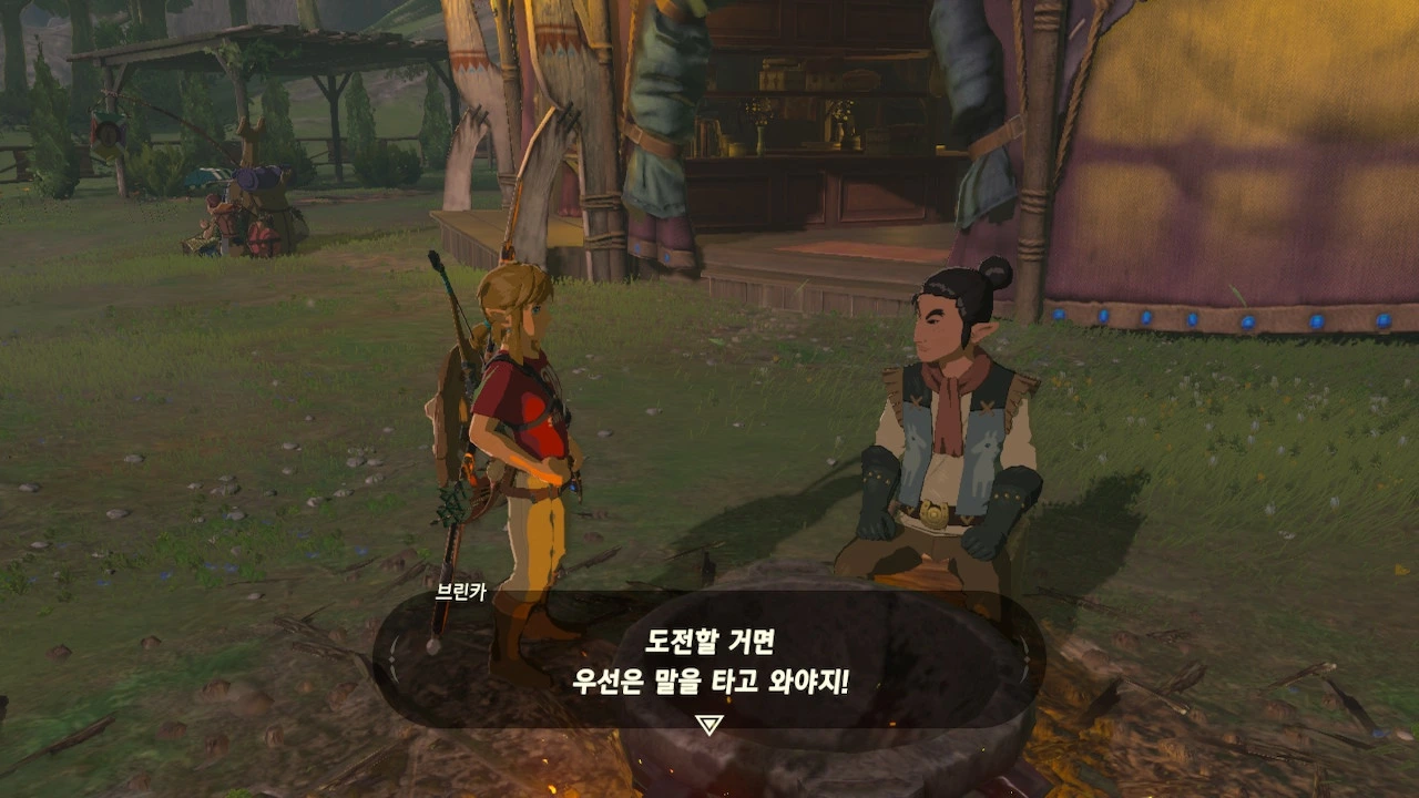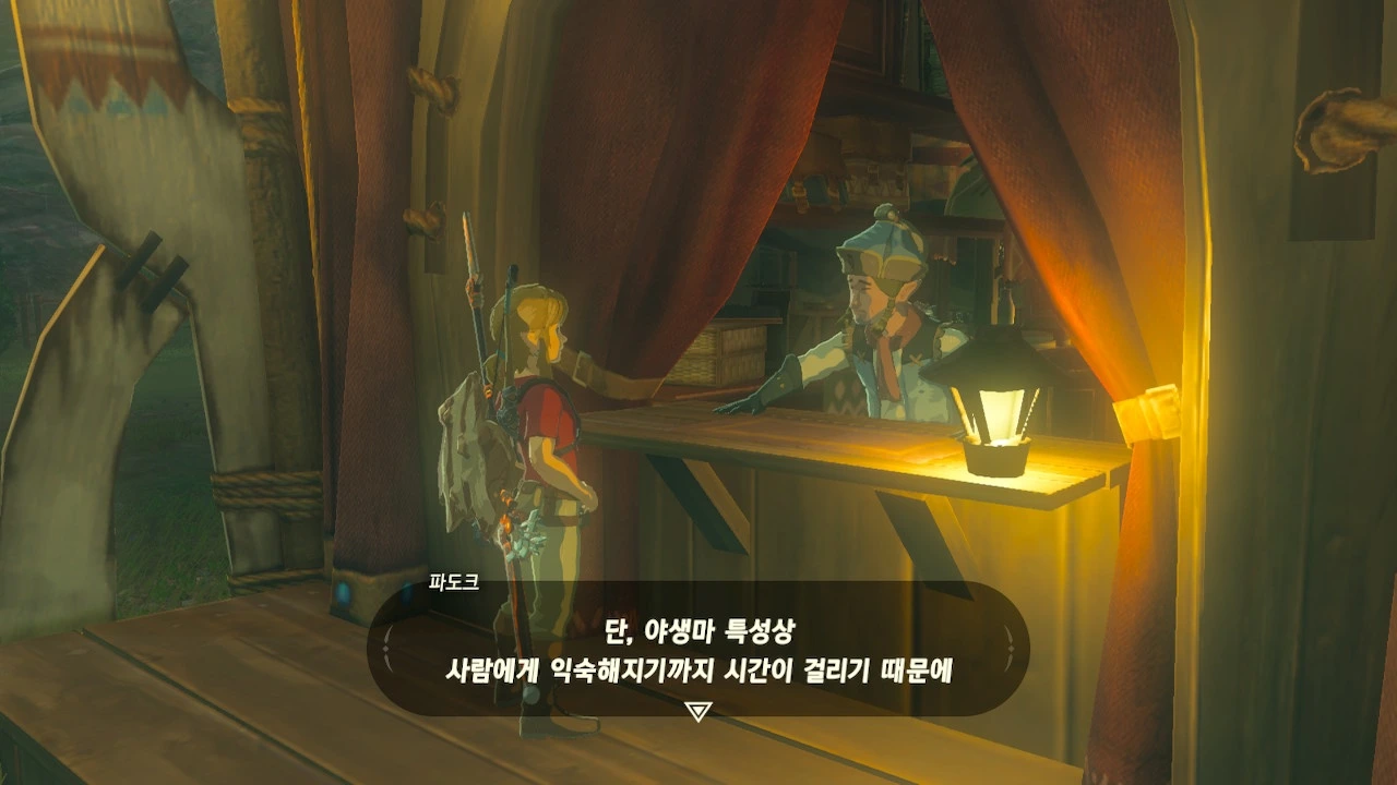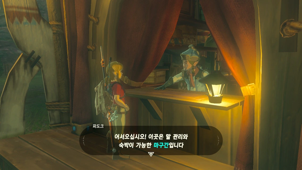 그는 장부를 탁 덮더니 빙그레 웃으며 말했다. 마구간은 여행을 하는 사람들의 말을 대신 맡아 주고 관리를 해 주는 곳이며 안쪽에는 침대가 있어 숙박도 가능한 곳이다. 숙박을 하려면 마구간 텐트 안으로 들어와서 다른 카운터에 말을 걸면 가능하다고 했다. 하이랄 곳곳에는 마구간이 있는데, 이 곳에 말을 맡기면 다른 마구간에서도 자신의 말을 찾아 길을 떠날 수 있다고 한다. 엄청 편리하지 않냐면서, 다소 신나 보이는 마구간 주인은 내게 야생마 이야기를 꺼냈다.