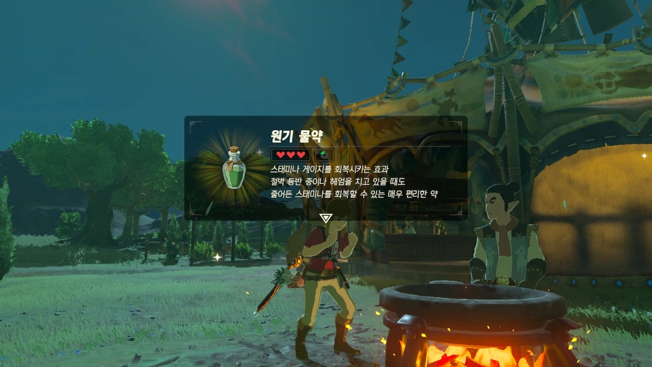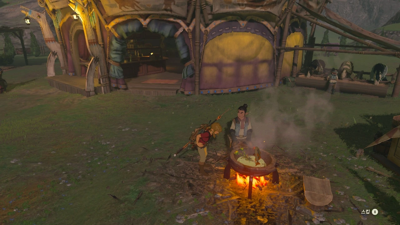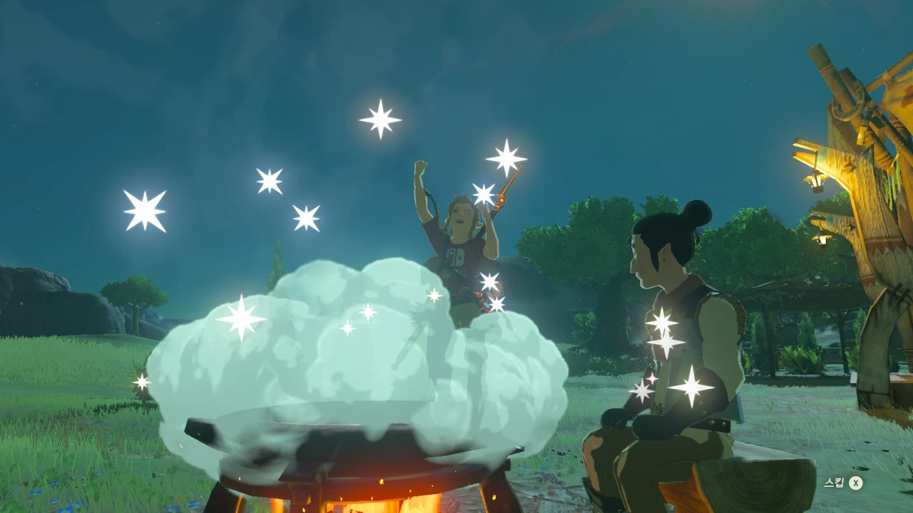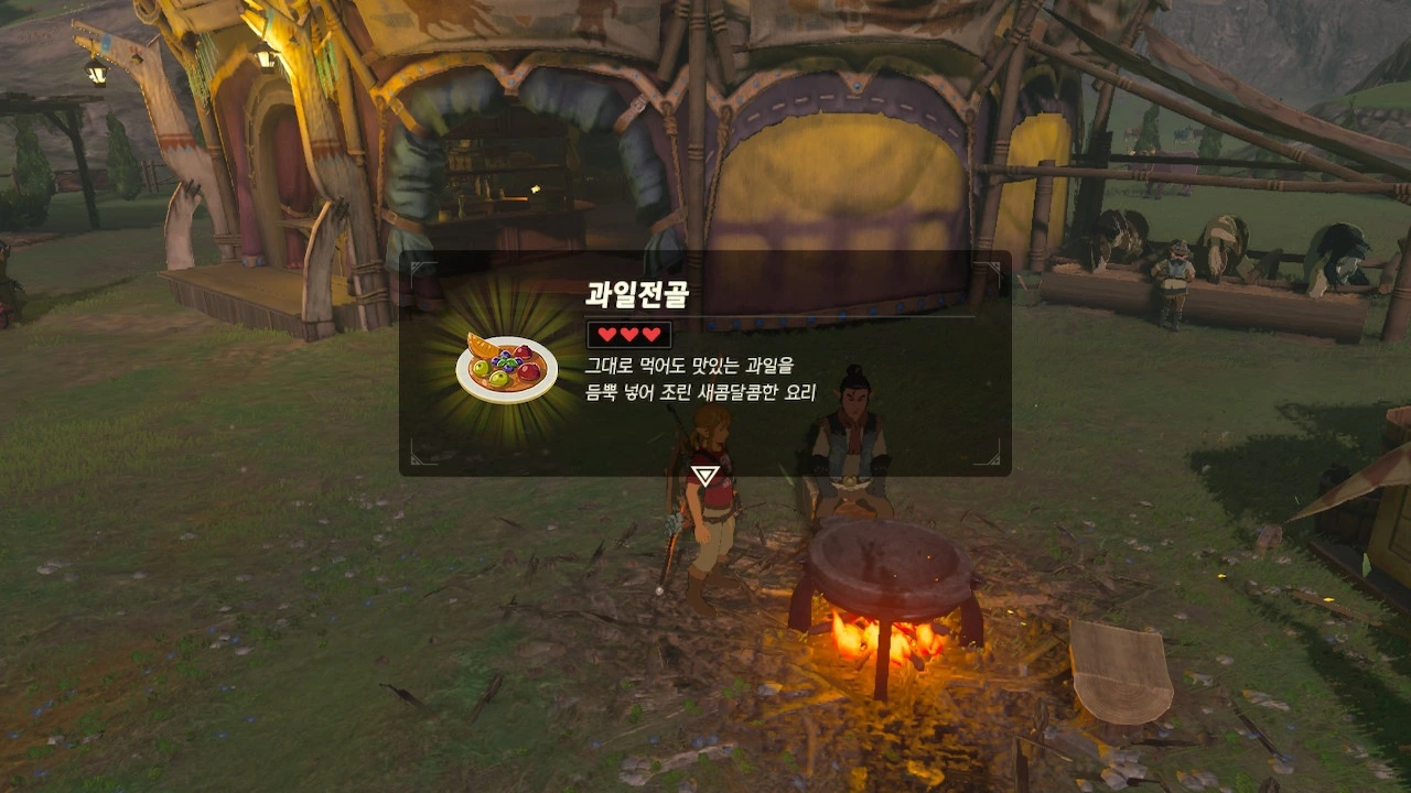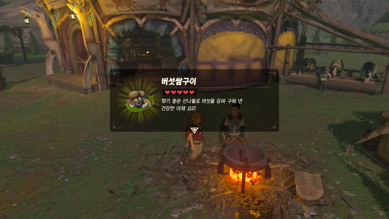 주변을 돌아보니 그 새 밤이 되었다. 전투의 긴장이 풀어지며 노곤한 기분이 들었다. 브린카 앞에는 커다란 요리 냄비가 있고, 따스한 장작불이 타닥타닥 타고 있다. 불을 보니 배고파졌다. 그래서 여기까지 오면서 채집한 요리 재료들을 가지고 비상식량을 몇 개 만들었다. '하이랄초'와 '하이랄버섯'을 함께 넣어 '버섯쌈구이'를 요리하고, 여러가지 과일도 넣어 끓였더니 '과일전골'이 만들어지기도 했다. 다 처음 보는 요리들이라 무슨 맛일까 기대가 되었다.