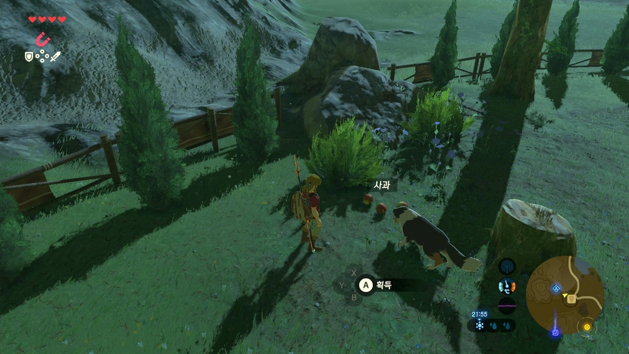 그 커다란 개는 덩치가 큰 것 치고는 싹싹한 태도를 보였다. 내가 쳐다보자, 바로 나의 눈을 맞추어 바라보고는 꼬리를 흔들며 반가워했다. 그 모습이 귀여워 품속에서 사과를 몇 개 꺼냈다. 고기가 있으면 주고 싶었지만, 시작의 대지에서 나온 이후로 동물 사냥은 실패의 연속이라 고기가 없었다.