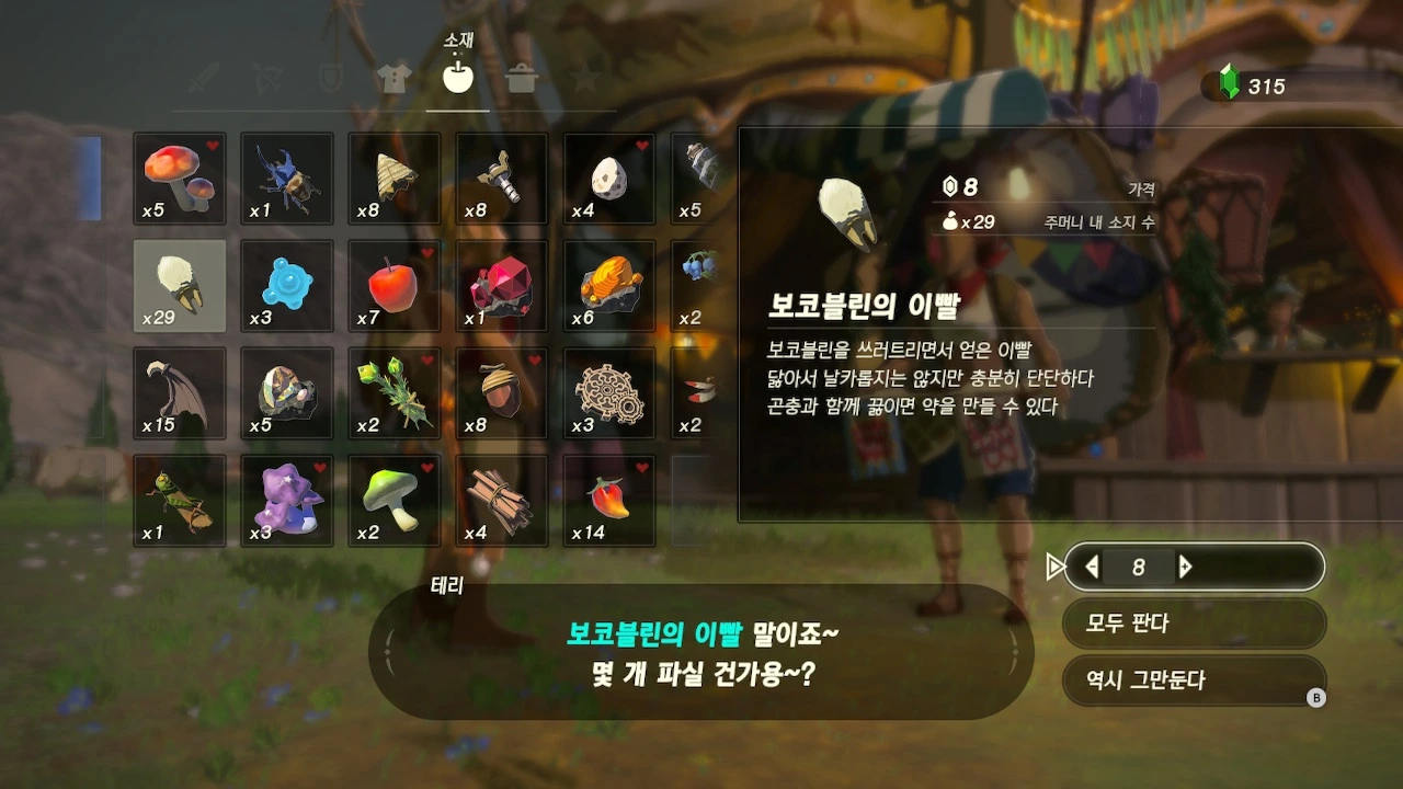 그가 가지고 있는 물건을 구경하고 싶어 물건을 보여달라고 하니 신나게 보여준다. 나무화살과 주변에서 볼 수 있는 곤충 외에 별 물건은 없었다. 곤충은 물약을 만들 수 있는 소재라고 하지만, 테리가 매긴 값은 기대보다 아주 비쌌다. 그래서 그에게서는 화살만 샀다. 더 필요한 건 없냐고 묻길래, 가지고 있던 몬스터의 소재들을 몇 개 팔았다. 개별로는 몇 푼 되지 않는 것 같지만, 전투를 되도록 피하고 다녔는데도 그 새 쌓인 보코블린의 이빨이나 뿔은 5개만 팔아도 40루피 정도이니 나쁘지 않은 거래였다고 생각한다.