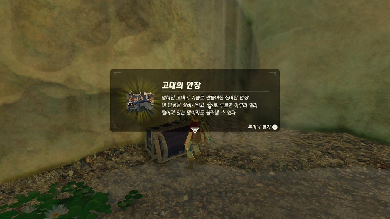 여기저기를 살펴보다 봉오리 뒤편, 바닥에서 바람이 새어 나오는 어느 구석에서 상자 하나가 있는 것을 발견했다! 분명 이 상자일 거야... 두근거리는 마음으로 상자를 열었더니, '고대의 안장'이 그 모습을 드러냈다. 야호!