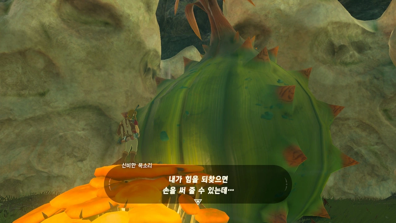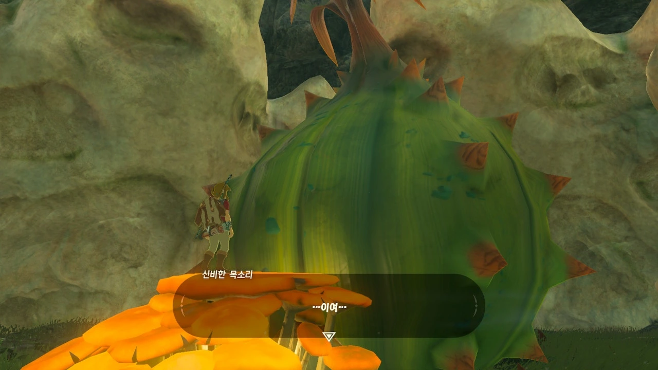 다시 혼자가 되어 길을 떠났다. 절벽을 올라와 보니 작은 바위가 일정한 패턴을 그리며 놓여있는 초원이 나왔다. 코로그 녀석이 숨어 있으려나 싶어 바위가 빠진 빈 자리에 다른 바위를 찾아 옮겨두었다. 그랬더니 펑! 하는 소리와 함께 또 다른 코로그가 나와서 이상한 냄새가 나는 그것을 준다.