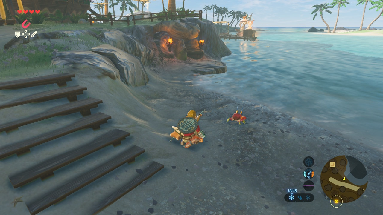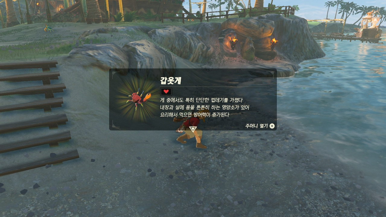 빨간 껍데기가 아주 단단해 보이는 게는 '갑옷게'라고 하고, 신비한 초록빛이 도는 껍데기를 가진 게는 '칼날게‘이고... 그냥 구워먹으려고 했더니, 요리해서 먹으면 각각 방어력이나 공격력을 올려준다고 한다. 또 신나서 요리할 이유가 생겼다.