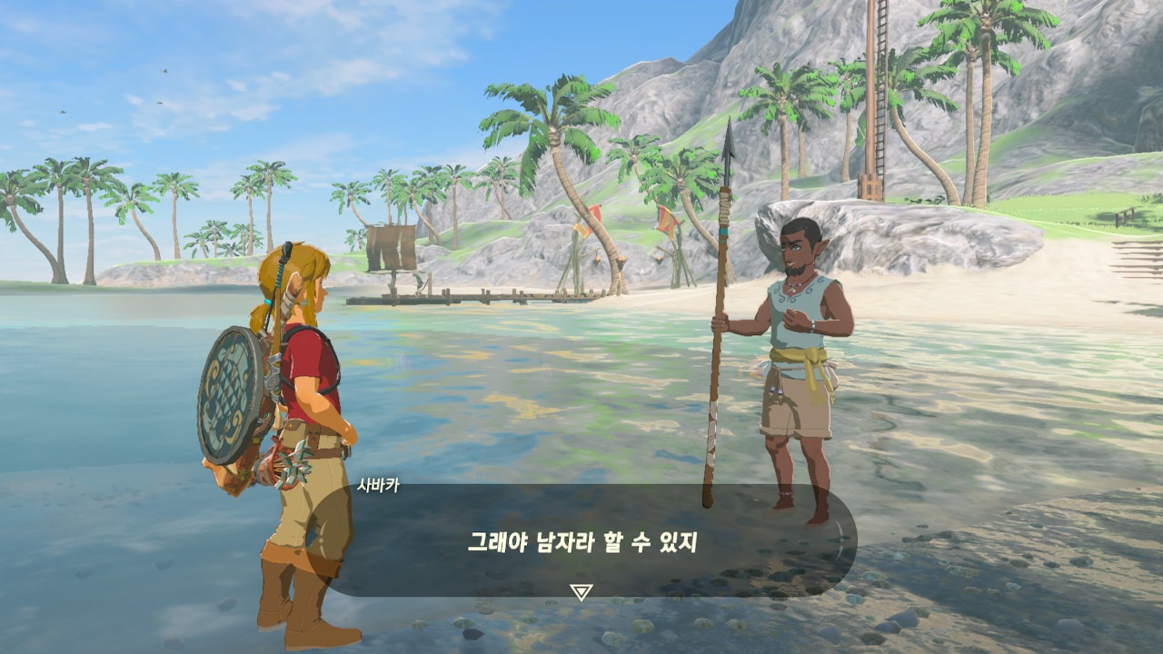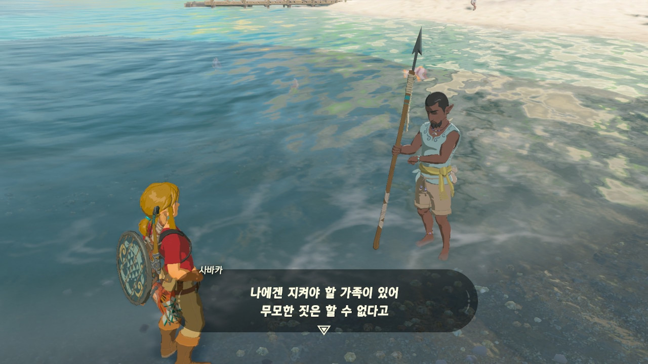 일단 맥스 소라를 찾으러 다시 바닷가로 나갔다가, 나는 꽤 큰 작살을 들고 있는 남자를 만났다. 그는 나를 보더니 여행자냐고 물었다. 간단히 인사를 나누다 그의 이름을 들었다. 사바카라고 하는 그 남자는 어부였다. 그는 기분이 그다지 좋지 않아 보였다.