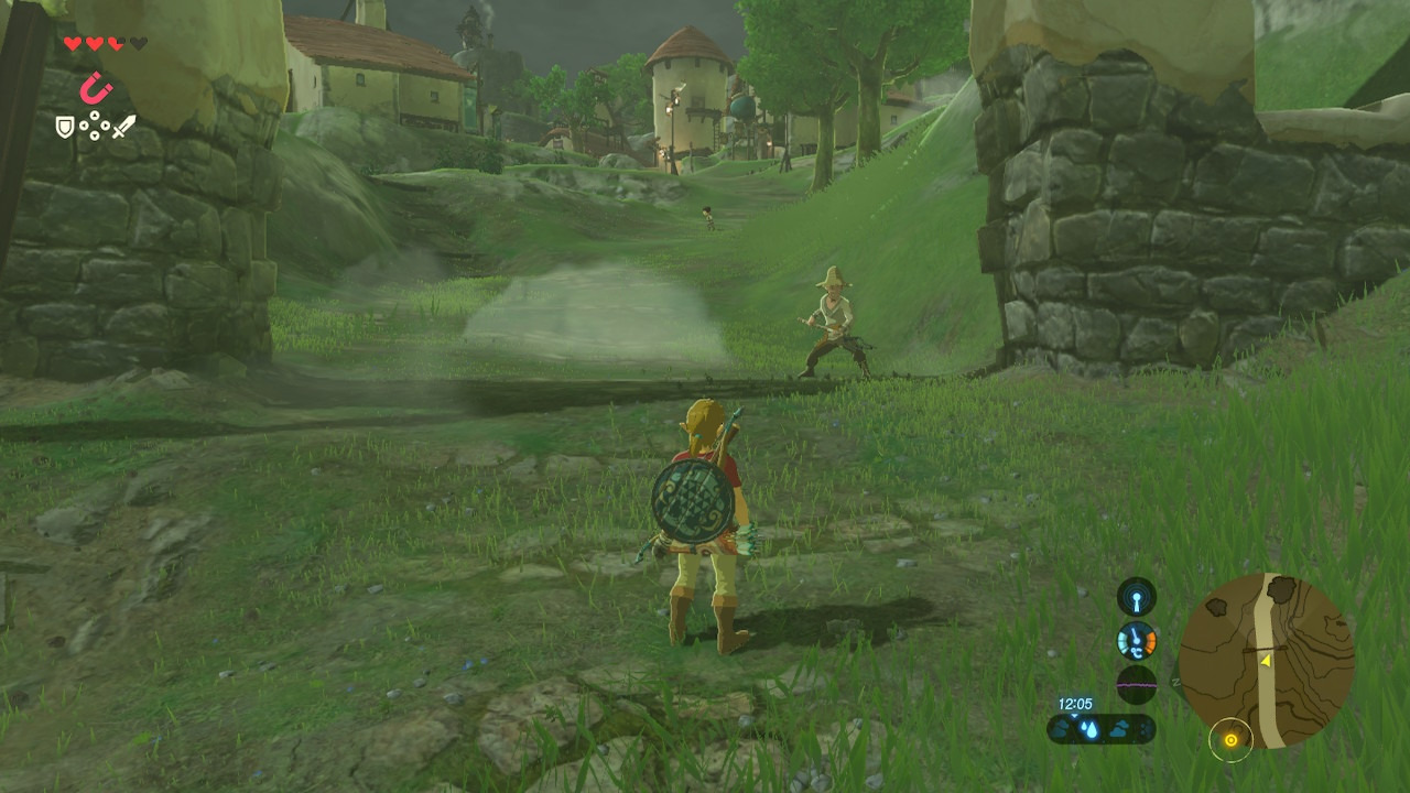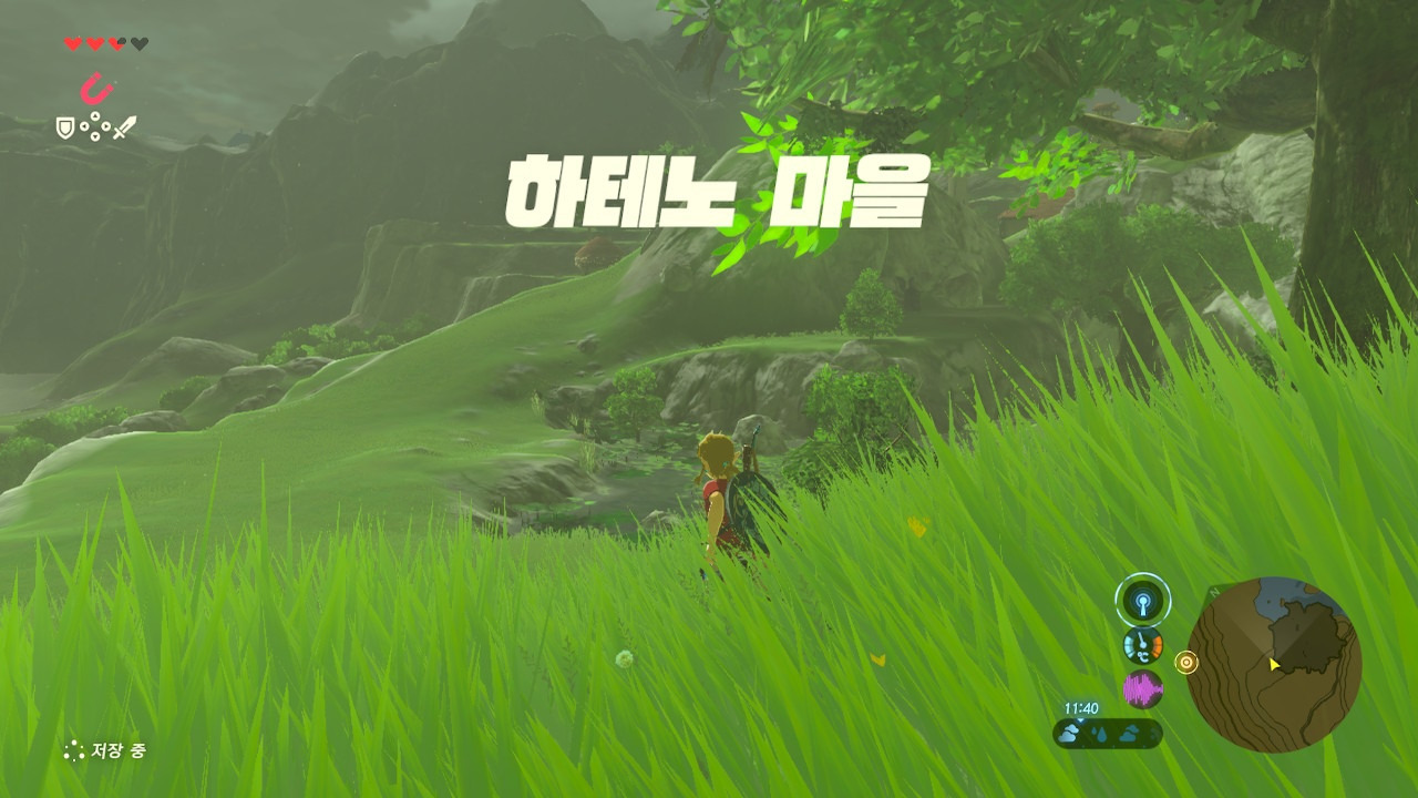 마을이 보이는 곳으로 패러세일을 펼쳐 하강한 후, 바닥에 착지하여 돌길을 부지런히 올랐다. 길 중간에 창을 들고 돌아다니는 블루 보코블린들이 보여서 그들을 피해 뛰었다. 수풀을 헤치고 올라 짧게 풀이 깎인 길로 들어서자, 시커 스톤에 '하테노 마을'이라는 메시지가 떴다.