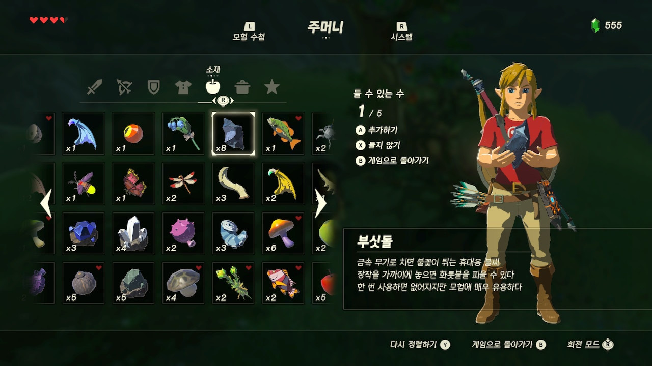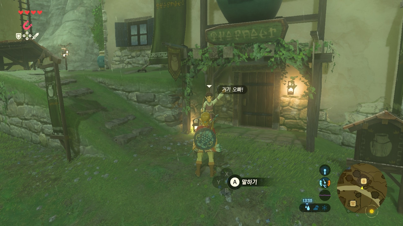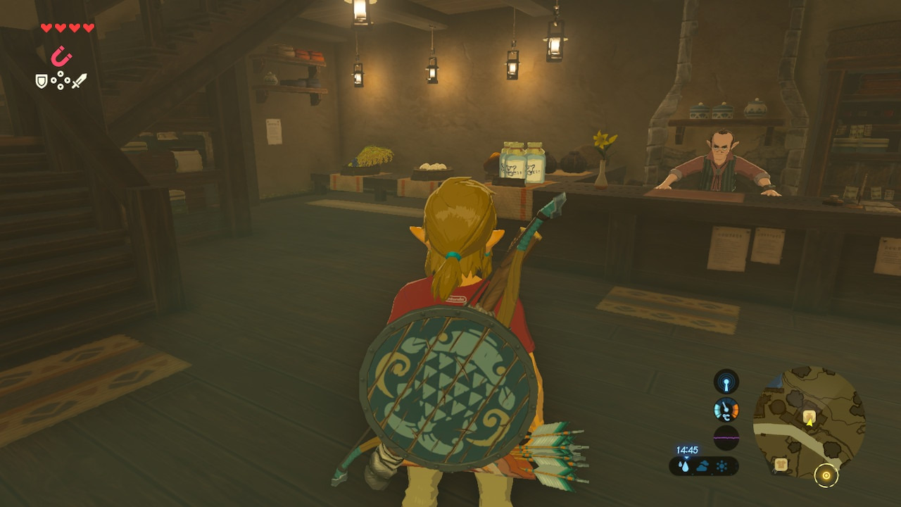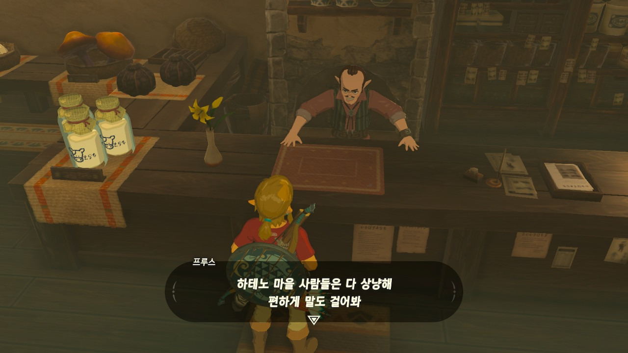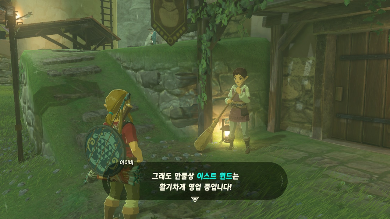 이스트 윈드에는 '만물상' 이름에 어울리는 다양한 물건을 팔고 있었다. 우유, 하이랄 쌀, 맥스트러플(도 파네?), 새의 알, 활력버섯, 그리고 화살 종류 몇 개... 불의 화살은 팔고 있지 않아서 아쉬웠다. 일단 화살을 비상용으로 더 구매하고, 만물상 주인으로 보이는 사람에게 말을 걸었다.