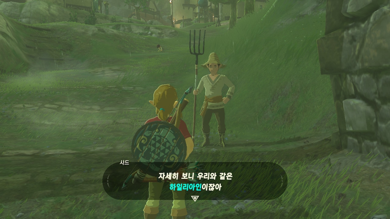좀 더 가까이 다가가 보는 것도 나쁘지 않겠다 싶어 그에게 다가갔다. 그는 나를 유심히 보더니, 쇠스랑을 다시 세워 들고는 "자세히 보니 우리와 같은 하일리아인이잖아!" 라고 말했다.