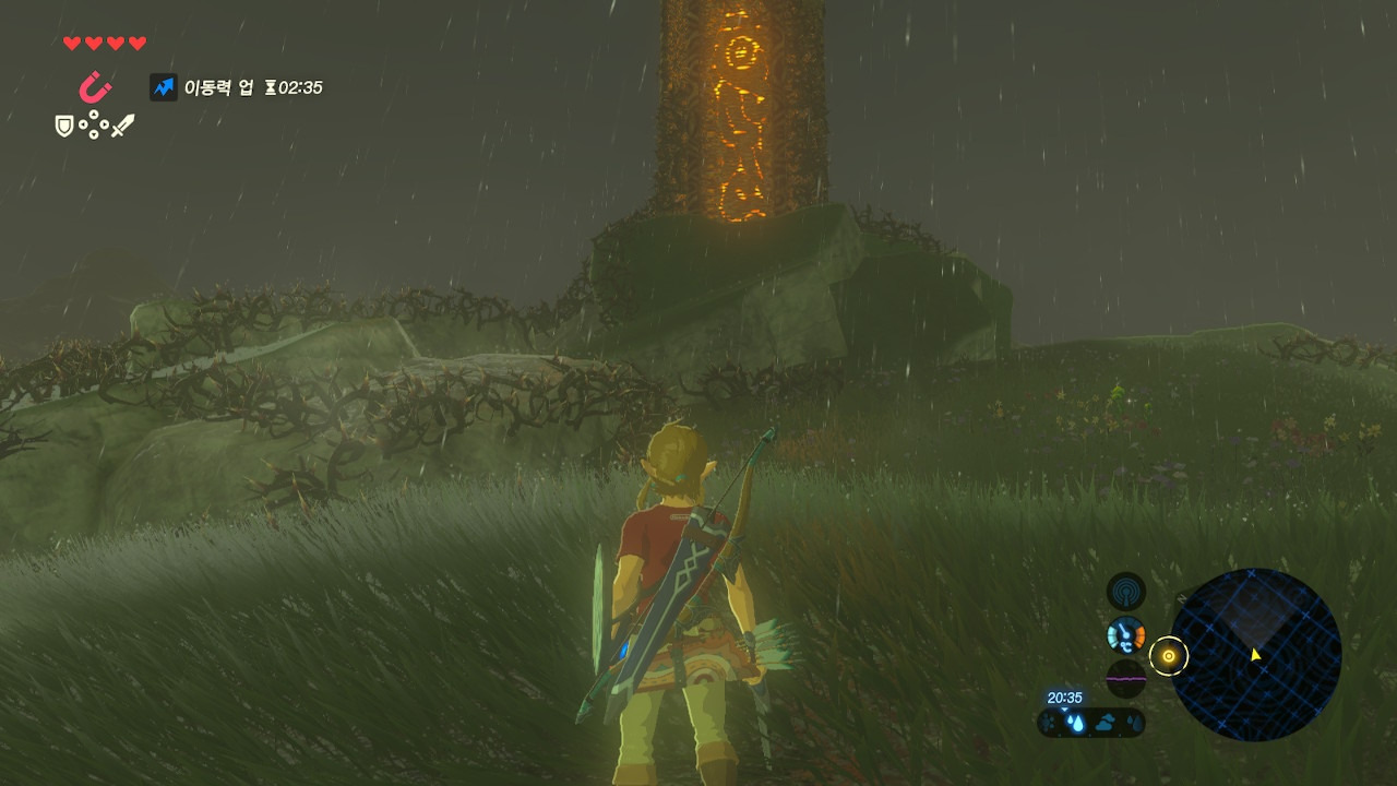 가시덩굴이 타서 없어진 자리를 확인하고, 탑을 오르기 시작했다. 중간에 쉴 수 있는 턱에 올랐더니, 그 위 기둥에 꼬여 있는 가시덩굴에는 불이 붙지 않았는지 그대로인 것을 알 수 있었다. 다시 내려가서 횃불의 불을 가져오기는 조금 귀찮아, 결국 불화살을 꺼냈다. 화살을 쏴서 기둥 위쪽의 가시덩굴을 태웠는데... 다 타기 전에 다시 비가 내리기 시작했다! 아... 여기는 왜 이렇게 비가 자주 오지? (화난다)