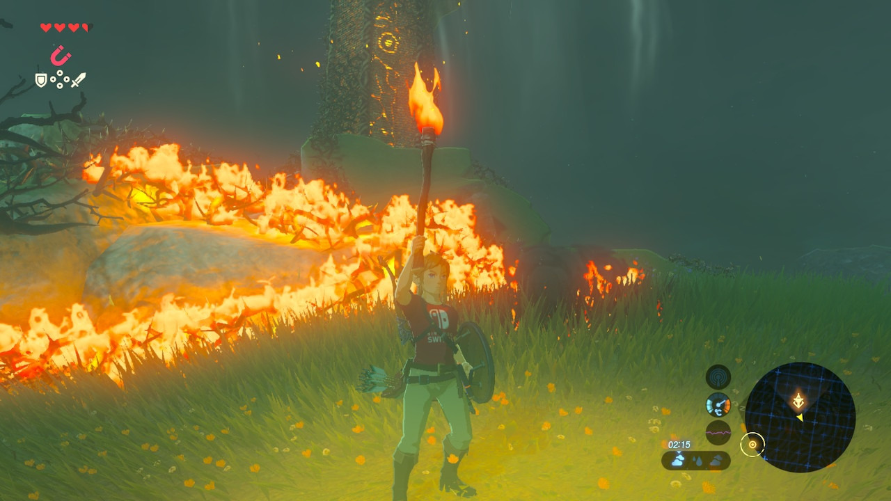 횃불에 불을 붙인 다음 탑 아래로 달려가 덩굴 여기 저기에 불을 놓았다. 비가 내려서 그런가 덩굴에 쉽게 불이 붙지는 않았다. 여러번 시도한 끝에, 불은 결국 붙더니 덩굴길을 따라 활활 타오르기 시작했다. 사방에 날리는 재에 눈이 따가웠지만 와우! 야밤에 급 불놀이를 하게 됐다. 불이 번져 탑의 기둥에 꼬인 가시덩굴에도 불이 붙어 타올랐다. 공기의 흐름이 바뀔 정도로 센 불은 상승 기류를 만들어내며 불꽃이 점점 커졌다.