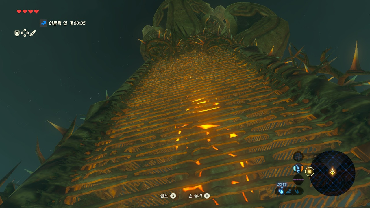 회복하는 음식 하나를 먹은 후, 다시 심기일전하여 기둥을 올랐다. 이번엔 아래에서 가시덩굴이 없는 자리를 꼼꼼히 확인했다. 탑 입구 주변에 가시덩굴이 남아 있는 부분이 있었지만, 코너를 잘 공략하면 오를 수 있을 것 같았다. 천천히 가시를 조심하면서 차근차근 올랐더니, 아까와 같은 실수 없이 탑에 도착했다. 시커 스톤을 인증했더니 붉은 빛이 파랗게 바뀌며 탑이 작동했다.
