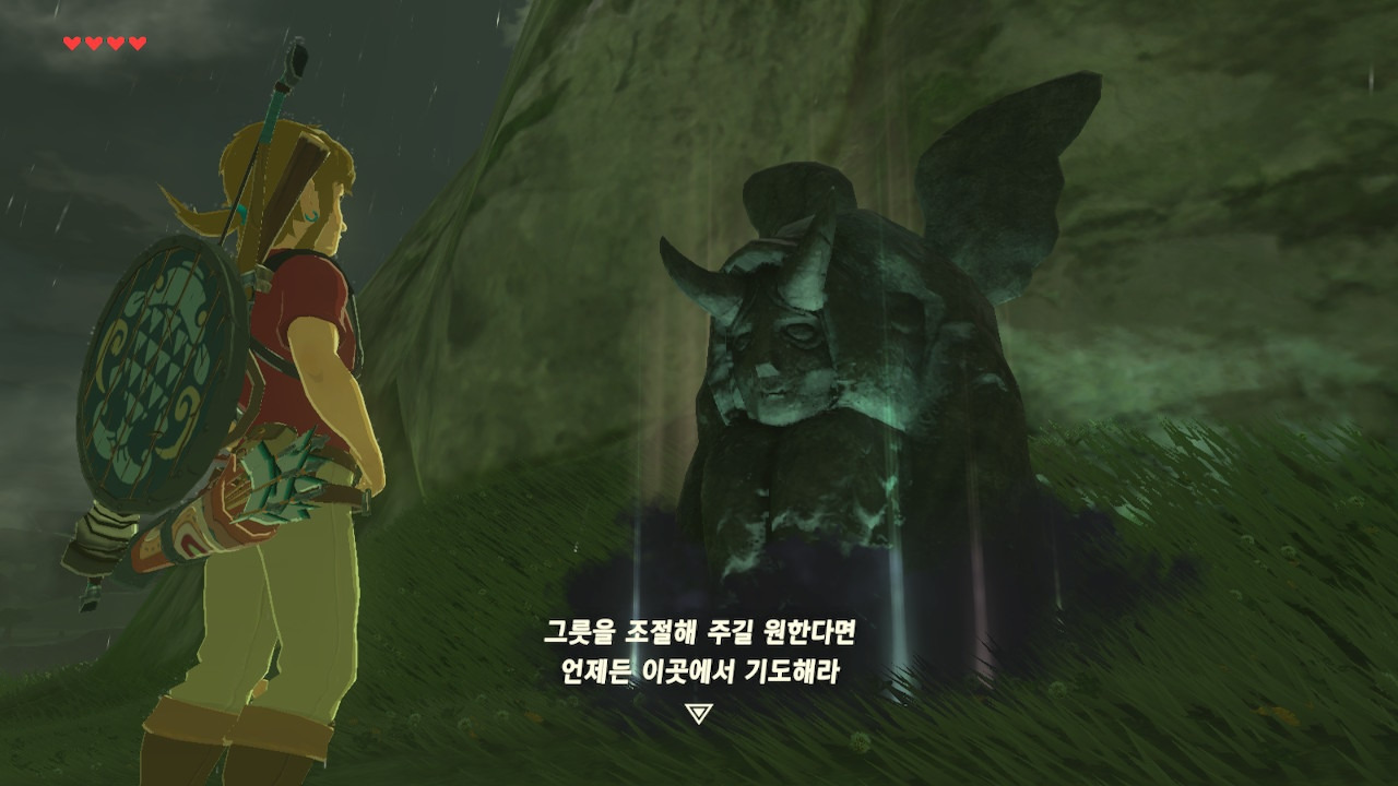 그런 의심스런 얼굴은 거두어도 좋다고 알린 악마상은 내게 거래 조건을 다시 이야기했다. 스테미나와 생명의 그릇을 조절하고 싶다면, 자신에게 와서 기도를 하란다. 악마상이 어떤 그릇이든 가져갈 때 그는 내게 100루피를 줄 것이다. 단 그 그릇을 다시 돌려받을 때는 생명이든, 스테미나든 내가 원하는 쪽으로 돌려주되 나는 120루피를 내야 한다. 결국, 악마상은 20루피에 내가 가지고 있는 생명력이나 스테미나를 다른 그릇으로 바꾸어 준다는 이야기였다. (간단하게 20루피 받고 해준다고 루피받고 가져갔다 돌려준다고 하면 되지, 왜 큰 돈을 주고 받고 해야 하지? 이해는 안 가지만....)