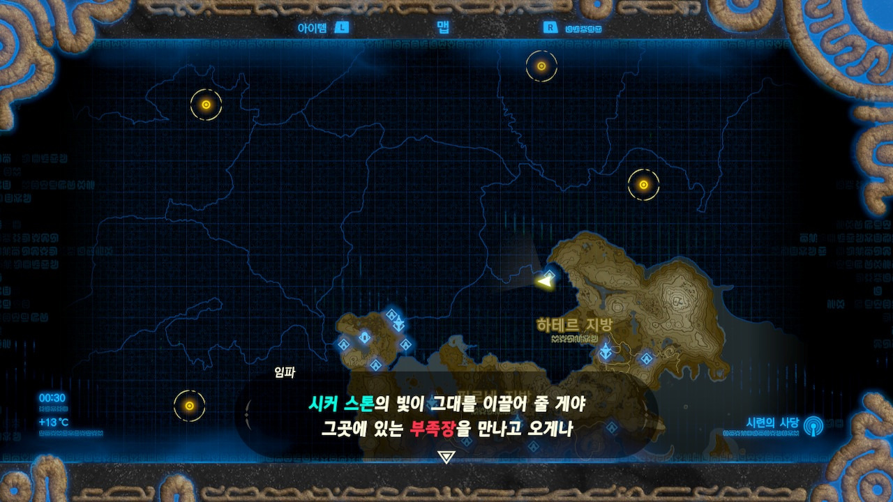 그제서야 나는 왜 목숨을 각오하고 젤다 공주의 전언을 들어야 하는지 깨달았다. 신수를 가논에게 빼았긴 상태라면, 그 안에는 어떤 위험이 도사리고 있는지 알 수 없는 상황일 거다. 즉 그 말은 신수에 타는 것 조차도 위험한 일... 그 위험을 무릅쓰고 신수에게 가야 하는 것이었다. 임파는 시커 스톤의 지도를 보여달라 하더니, 각 신수의 위치를 알려주었다.