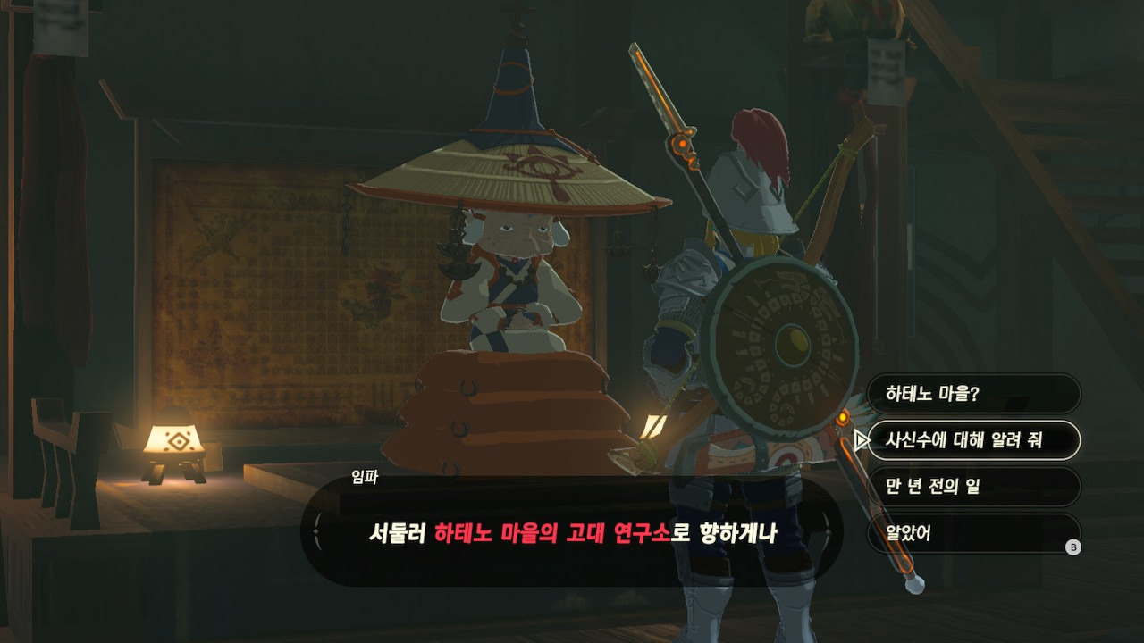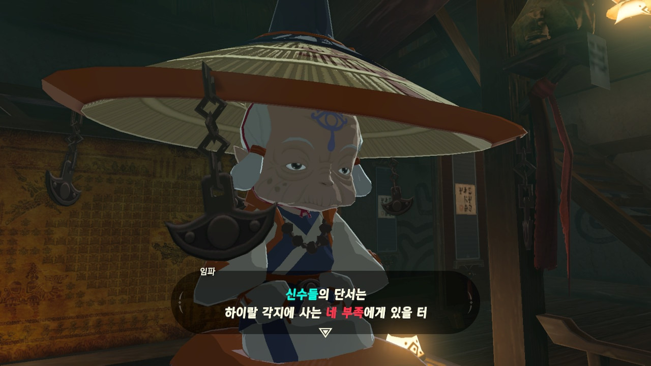 "신수에 타기 위해서는 단서를 얻어야 할 거네... 각 신수들의 단서는 하이랄 각지에 사는 네 부족에게 있을 터..."