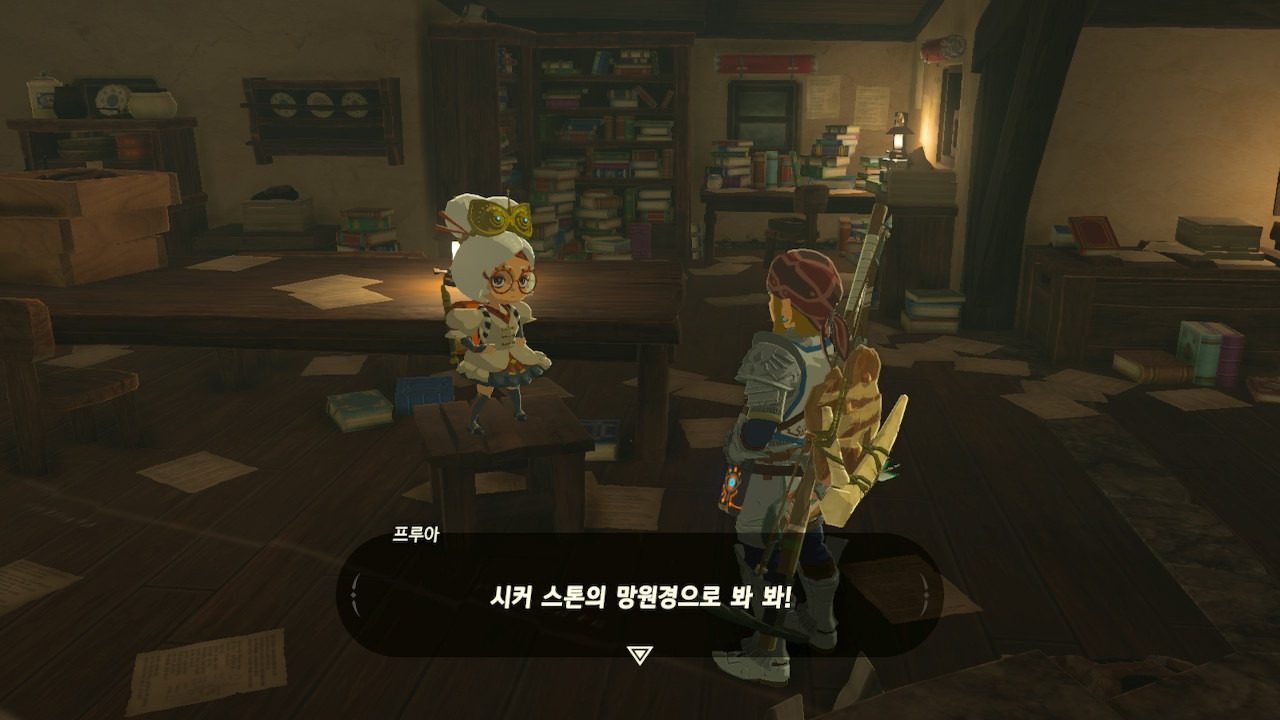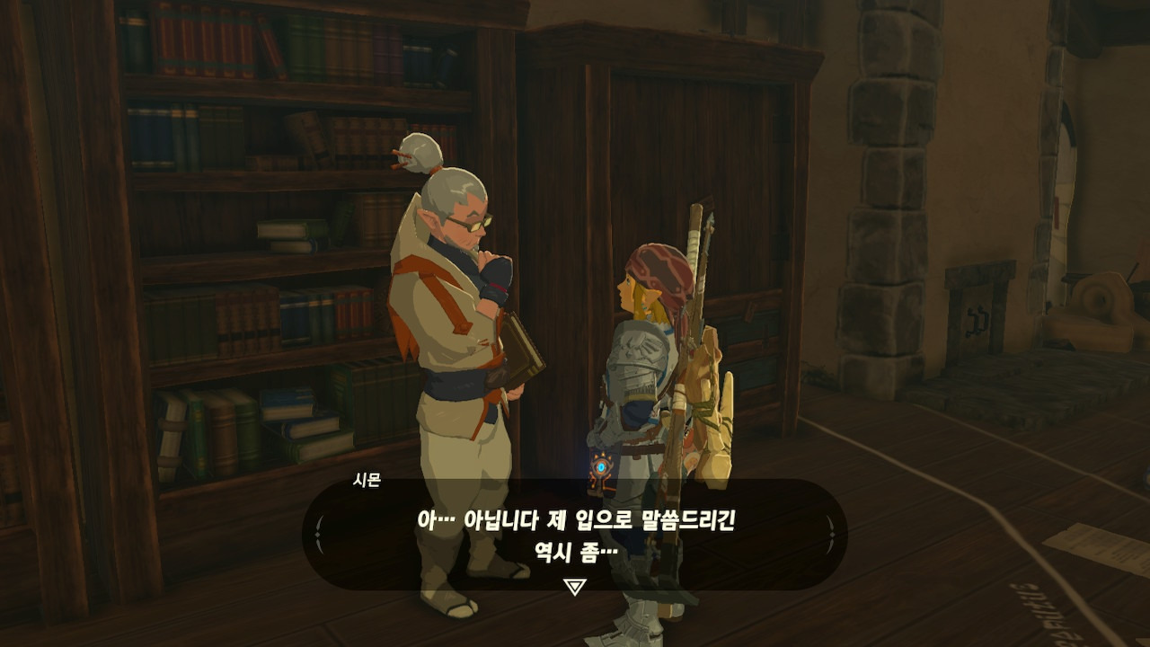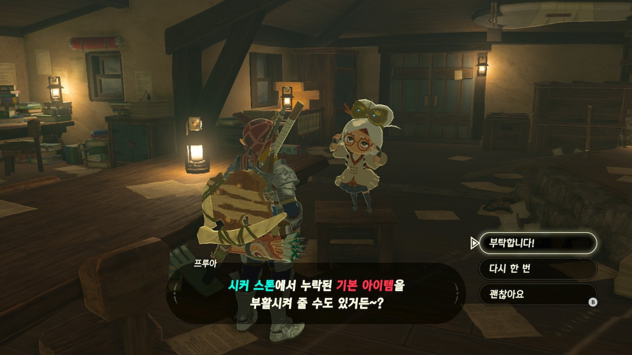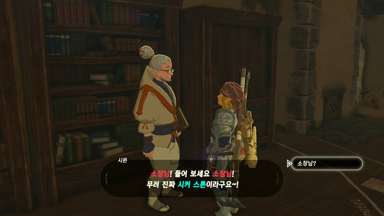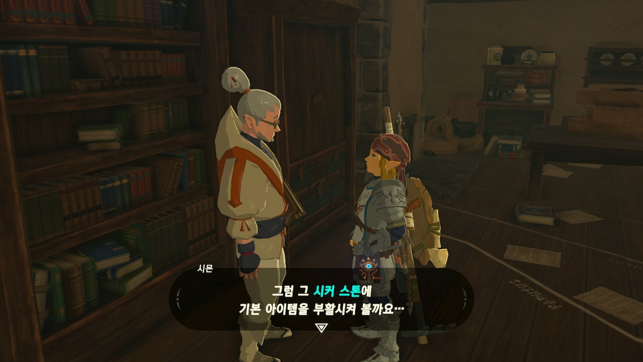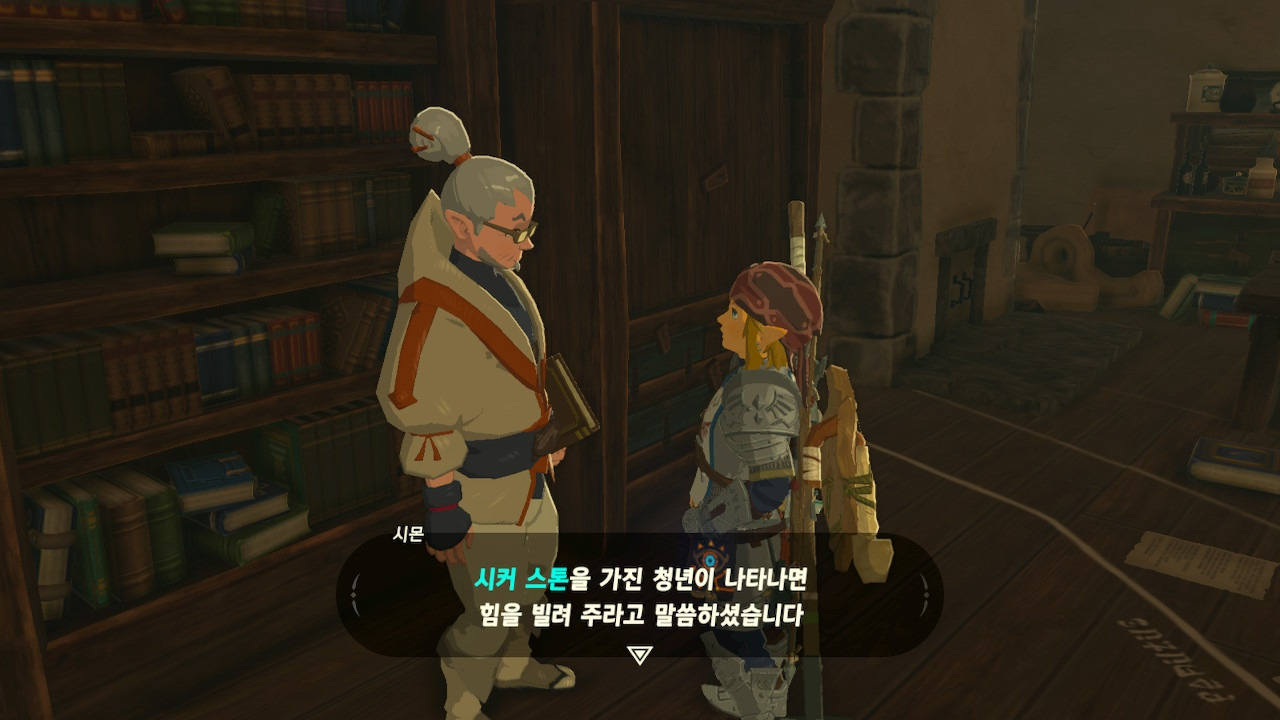 그녀는 다른 건 됐고, 본론으로 들어가서 시커 스톤 기능 회복에 대한 이야기를 하자고 했다. 그러면서, 내가 다시 힘을 축적하고 있는 재앙 가논을 쓰러뜨리고 젤다 공주를 구출하겠다는 의지와 각오가 충분하다면, 자기가 얼마든지 도와 줄 의사가 있으며, 시커 스톤의 기본 아이템을 부활시켜 줄 수 있다는 이야기도 했다.