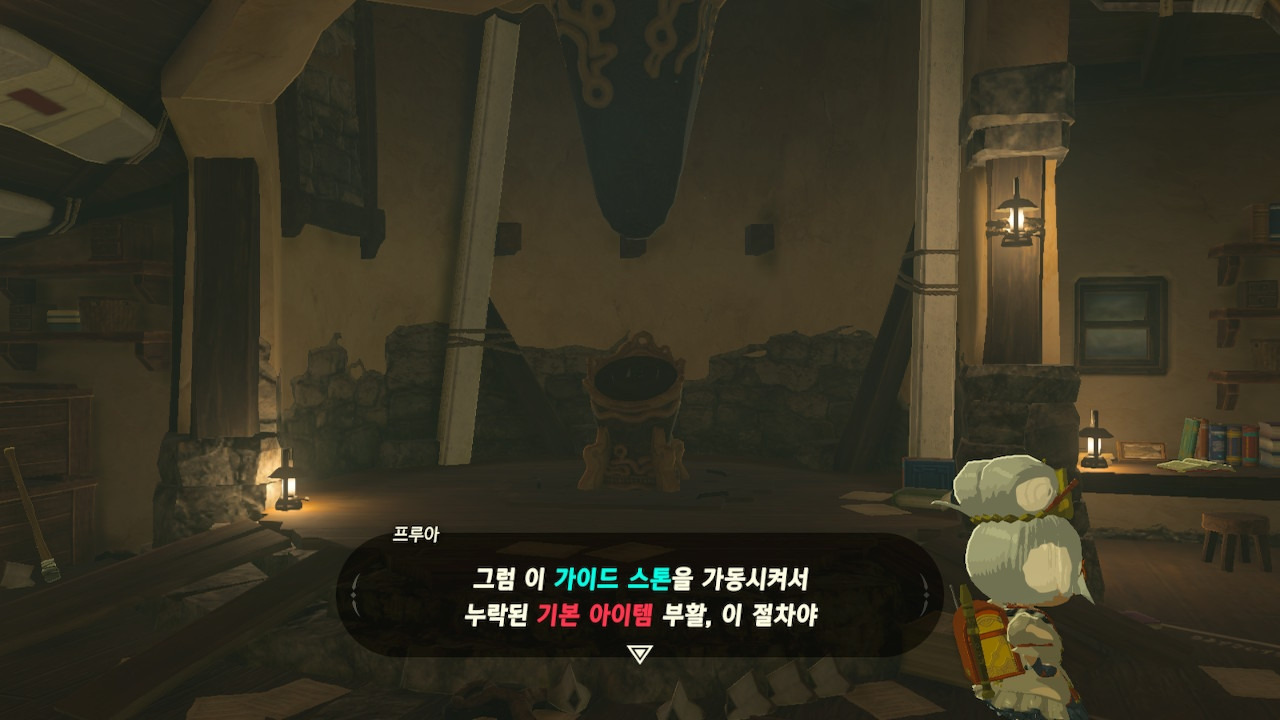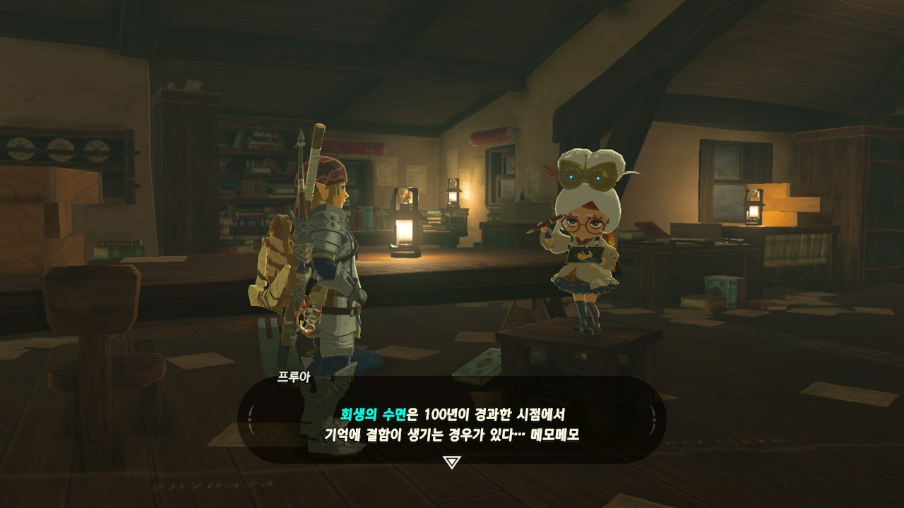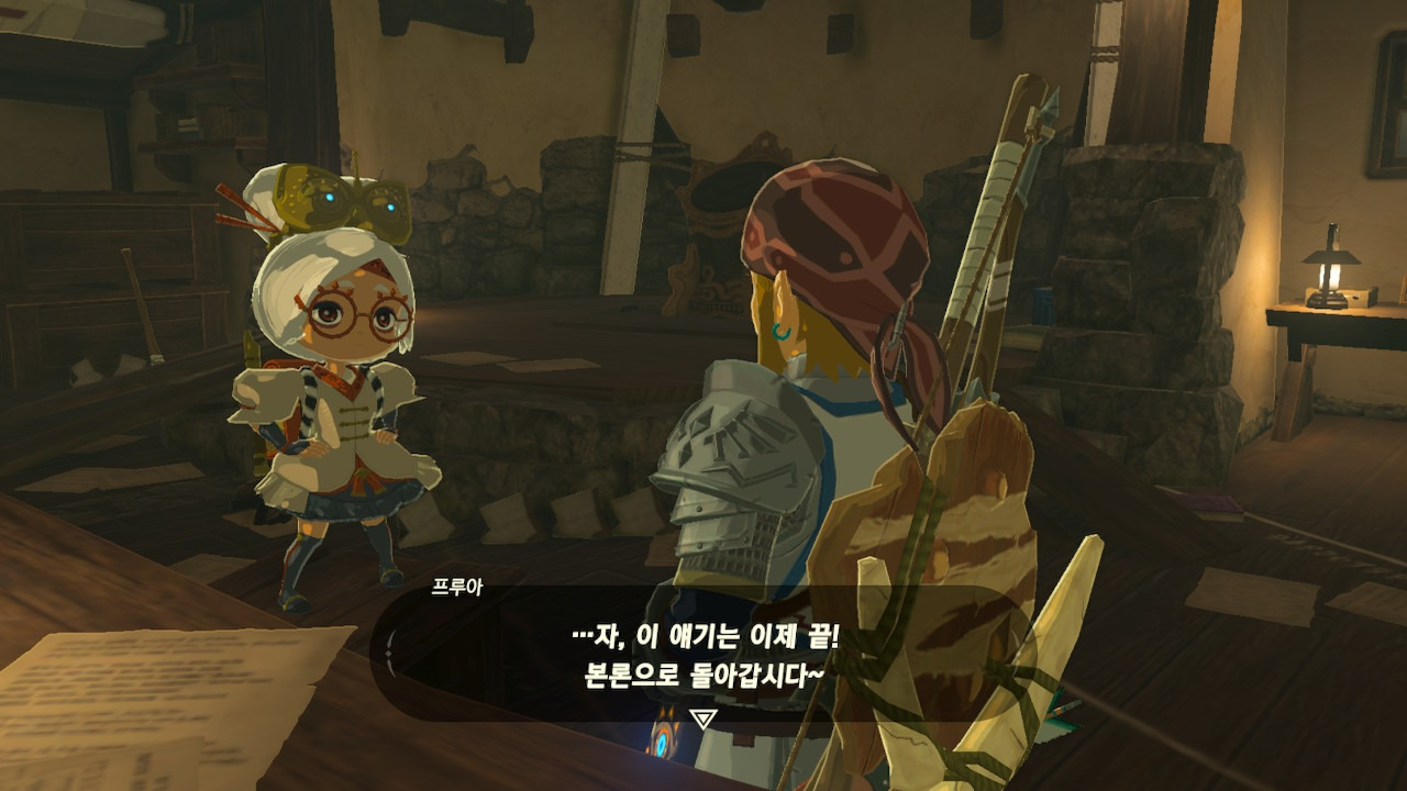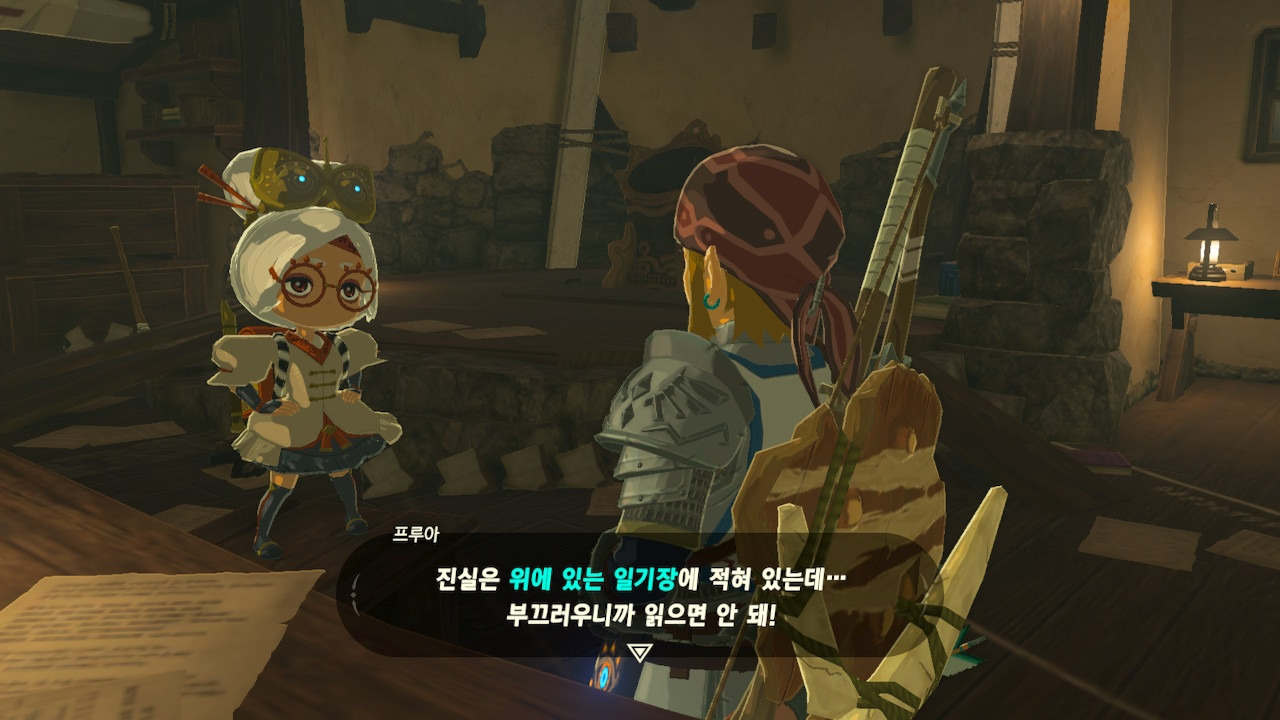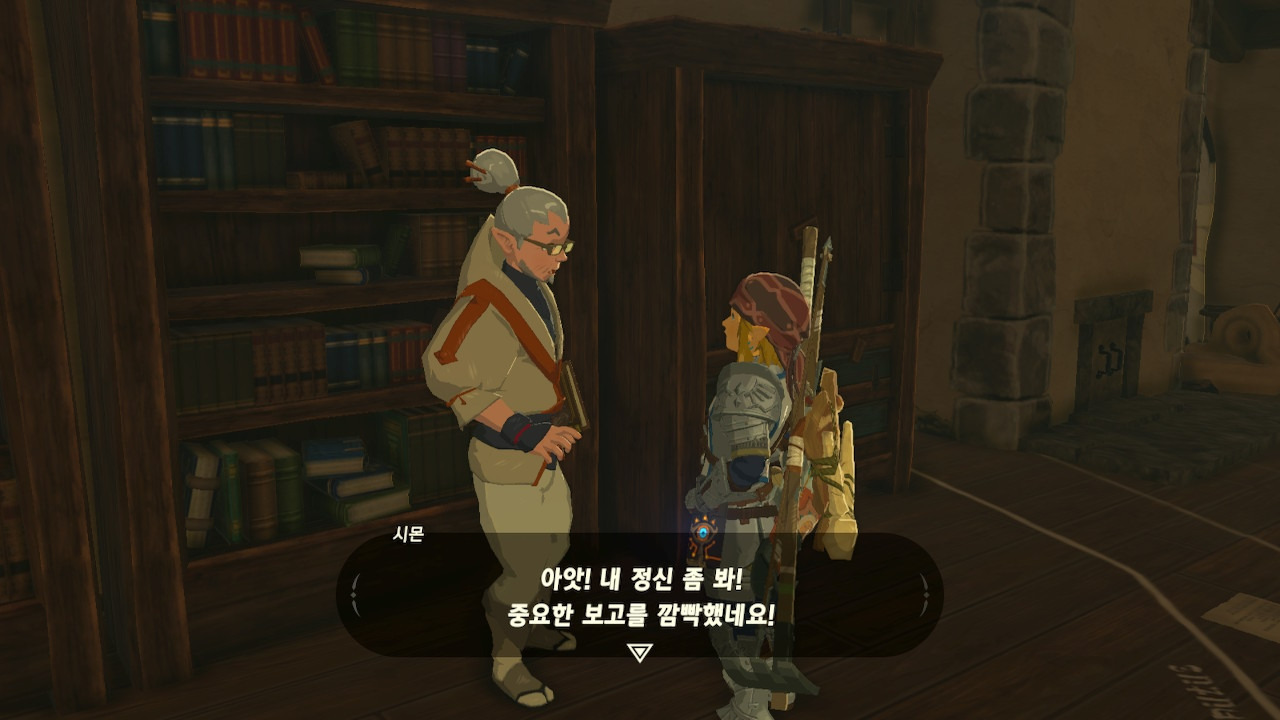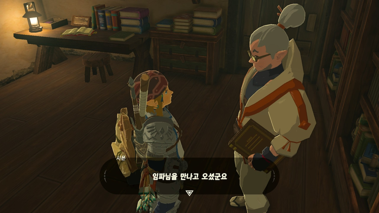 그녀는 다른 건 됐고, 본론으로 들어가서 시커 스톤 기능 회복에 대한 이야기를 하자고 했다. 그러면서, 내가 다시 힘을 축적하고 있는 재앙 가논을 쓰러뜨리고 젤다 공주를 구출하겠다는 의지와 각오가 충분하다면, 자기가 얼마든지 도와 줄 의사가 있으며, 시커 스톤의 기본 아이템을 부활시켜 줄 수 있다는 이야기도 했다.