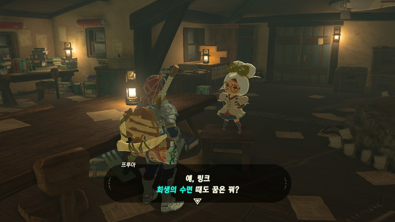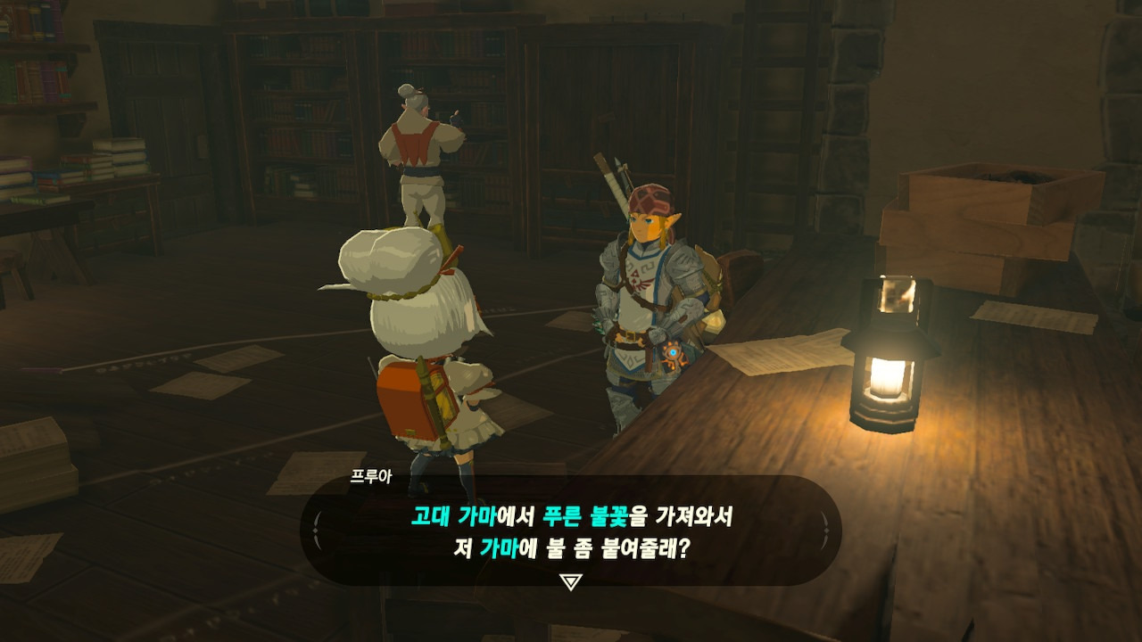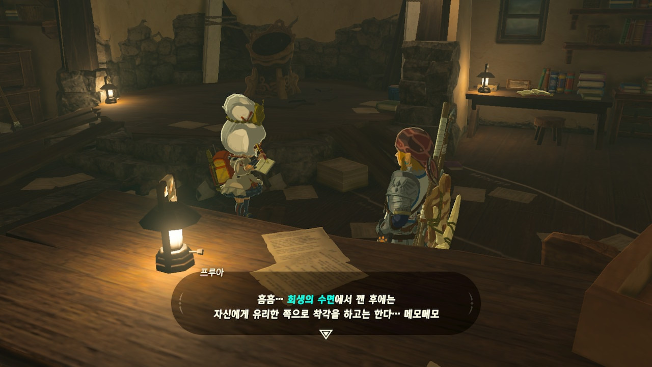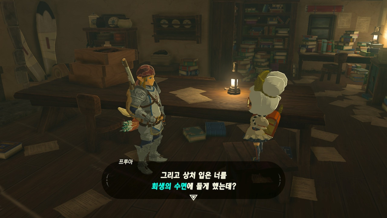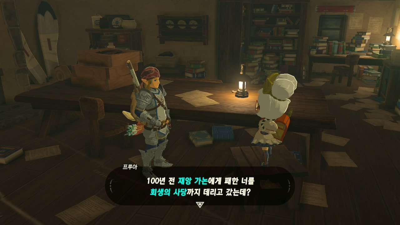 그녀는 다른 건 됐고, 본론으로 들어가서 시커 스톤 기능 회복에 대한 이야기를 하자고 했다. 그러면서, 내가 다시 힘을 축적하고 있는 재앙 가논을 쓰러뜨리고 젤다 공주를 구출하겠다는 의지와 각오가 충분하다면, 자기가 얼마든지 도와 줄 의사가 있으며, 시커 스톤의 기본 아이템을 부활시켜 줄 수 있다는 이야기도 했다.