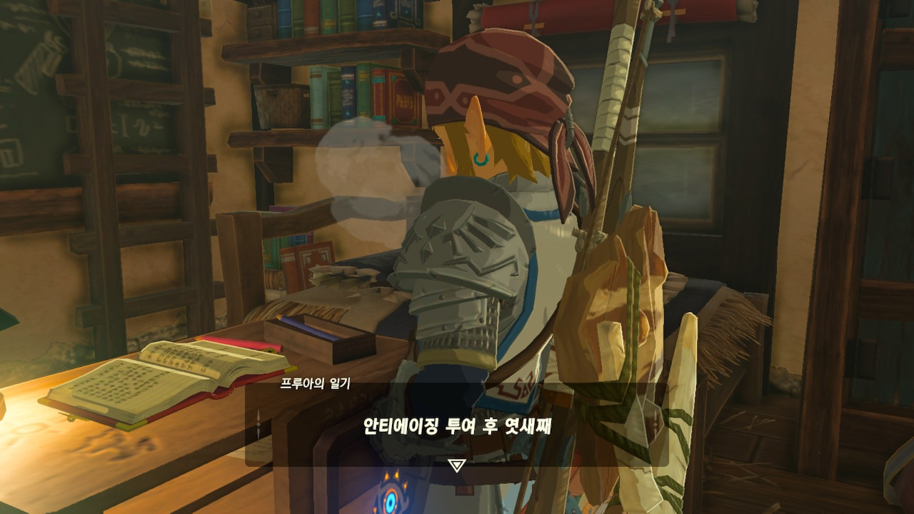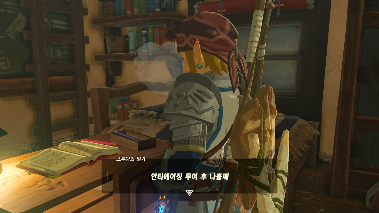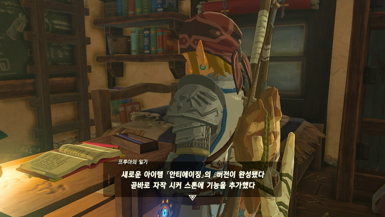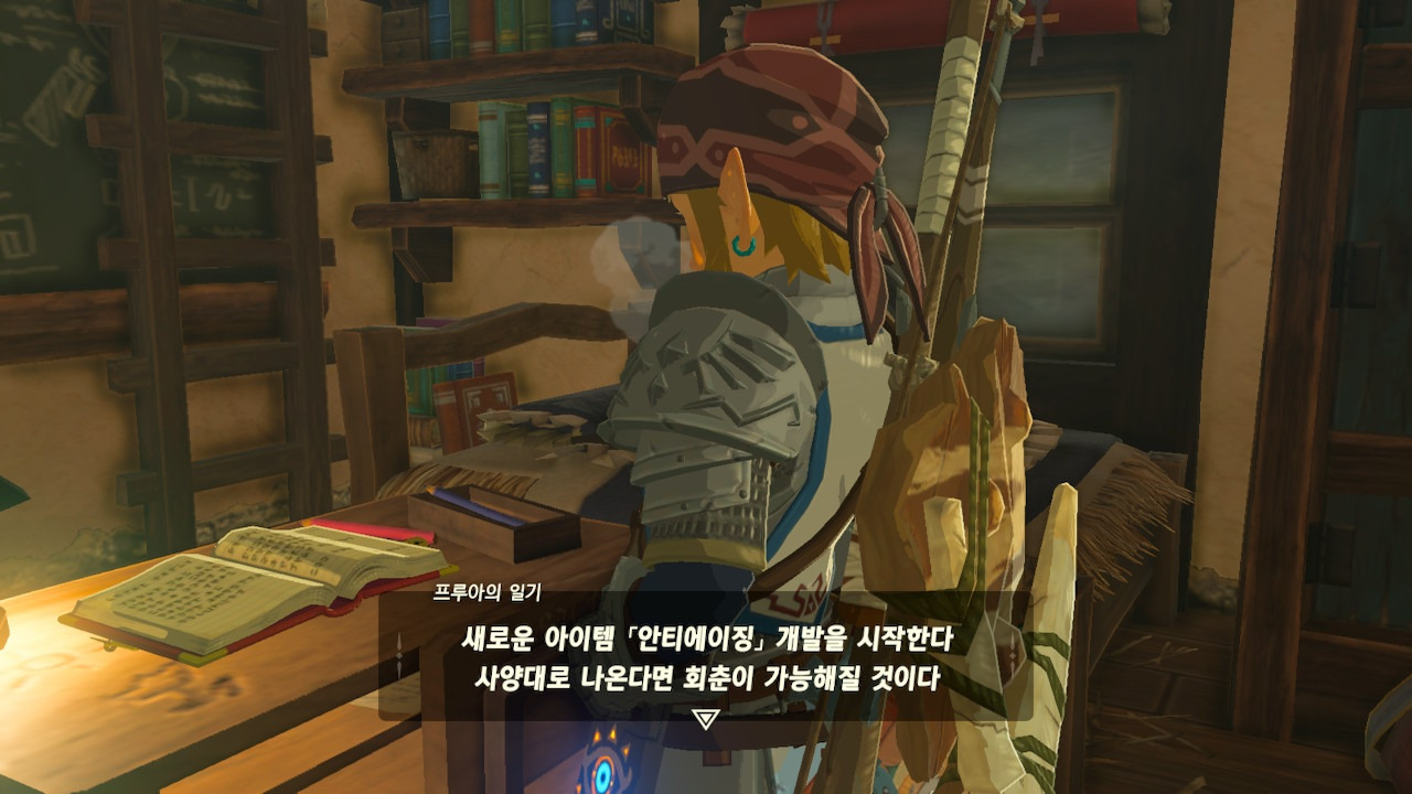 일기의 첫 부분에는 새로운 아이템 개발에 대한 이야기가 쓰여 있었다. '안티에이징'이라는 걸 개발한다는데, 이게 성공하면 나이 먹은 사람도 이전처럼 다시 젊어지는 회춘이 가능하다 했다. 아하... 프루아가 실험에 실패했다, 혹은 성공한 것인지도 모른다라고 말한 이유가 이것이었구나 싶었다. 다시 젊어지는 아이템을 개발하는 이유는, 가논 토벌을 준비하기 위해서라고 한다. 은퇴한 퇴역 군인들을 다시 젊어지게 만들 수 있다면, 병력 증강에 도움이 된다고....? 프루아의 일기는 매우 신기하고 흥미로운 내용이 가득해 책장을 넘기는 걸 멈출 수가 없었다...