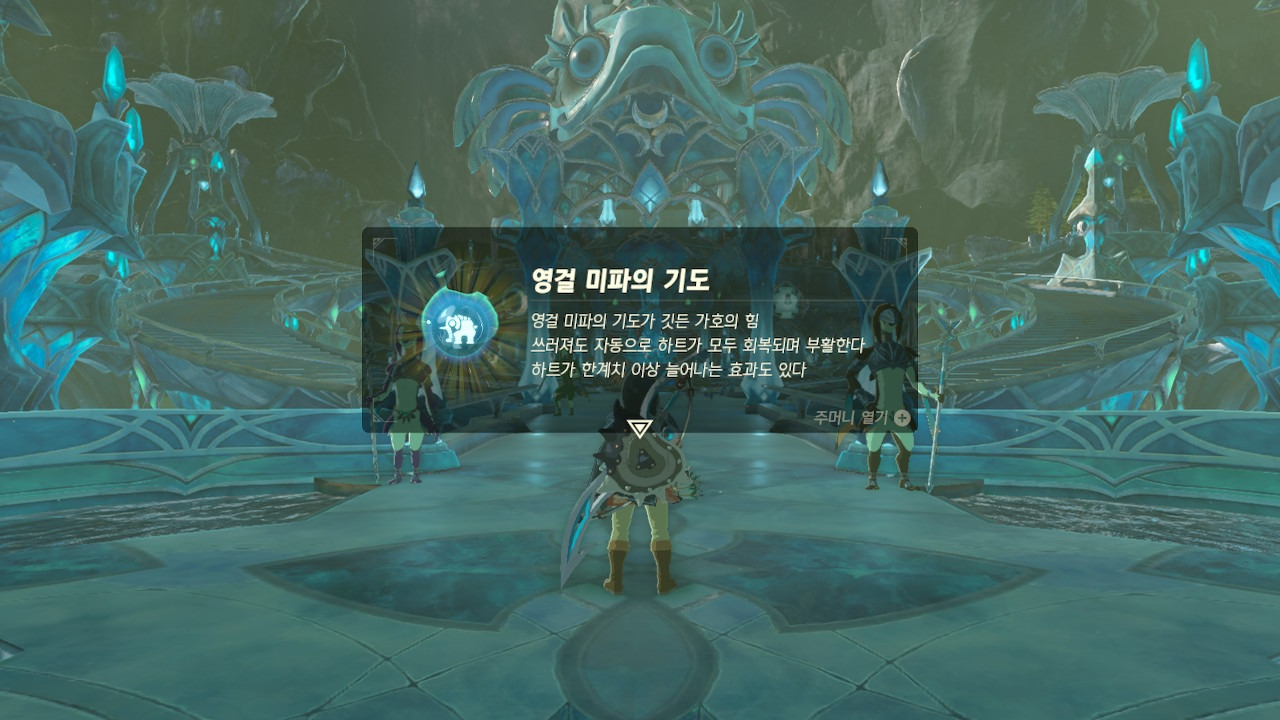 - 영걸 미파의 기도가 깃든 가호의 힘. 쓰러져도 자동으로 하트가 모두 회복되며 부활한다. 하트가 한계치 이상 늘어나는 효과도 있다.