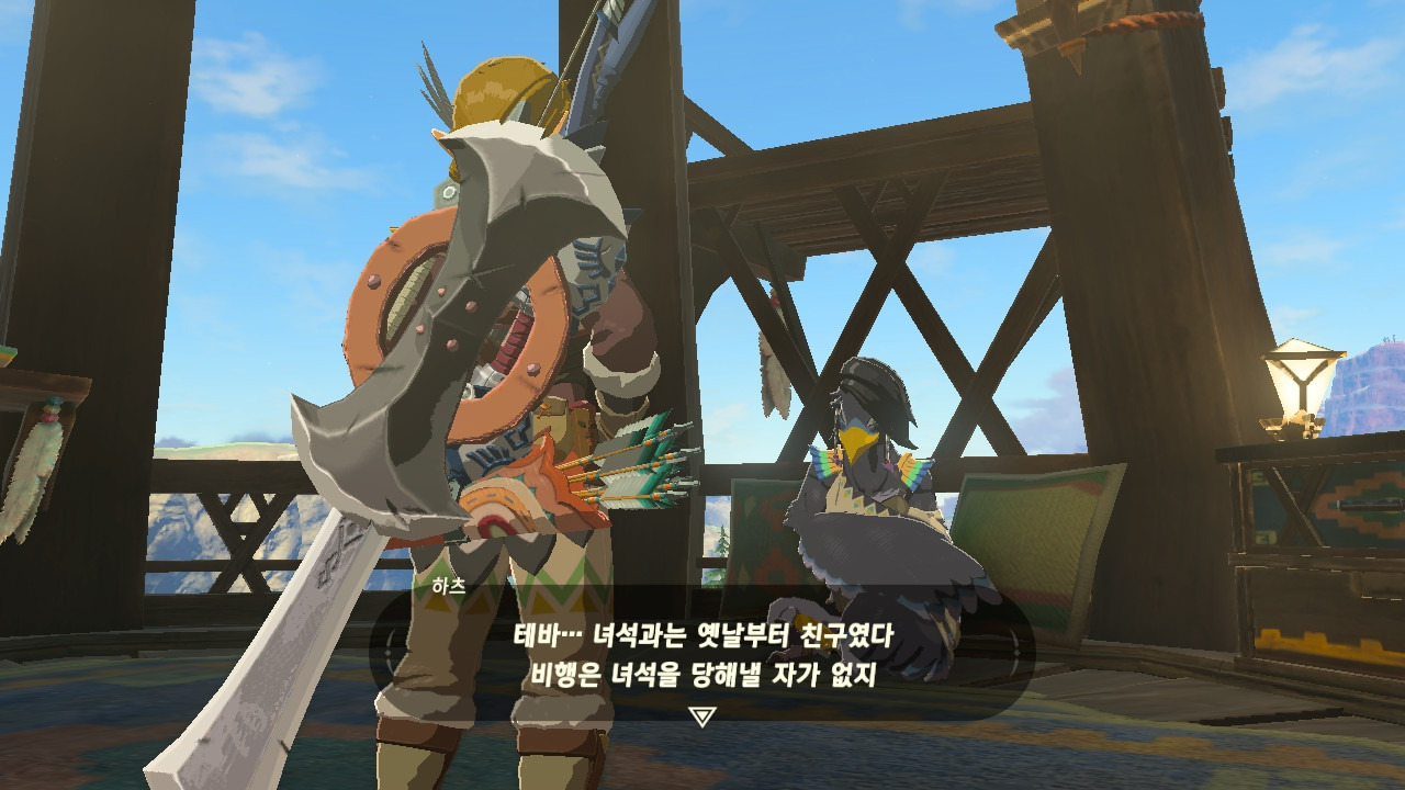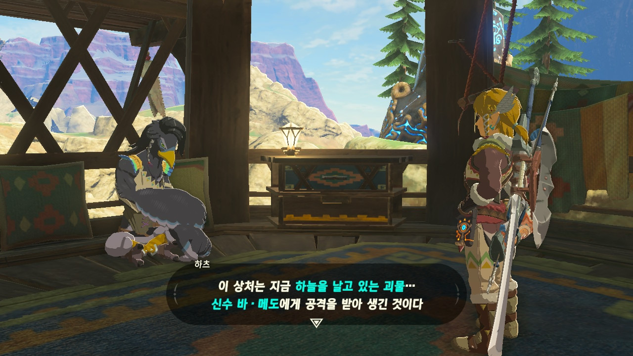 "이 상처는 지금 하늘을 날고 있는 괴물... 신수 바.메도에게 공격을 받아 생긴 것이다. 신수 바.메도.. 예전에는 마을 수호신이었다고 하더군... 그런데 녀석이, 나와 테바가 다가가자마자 갑자기 공격을 해 왔다."