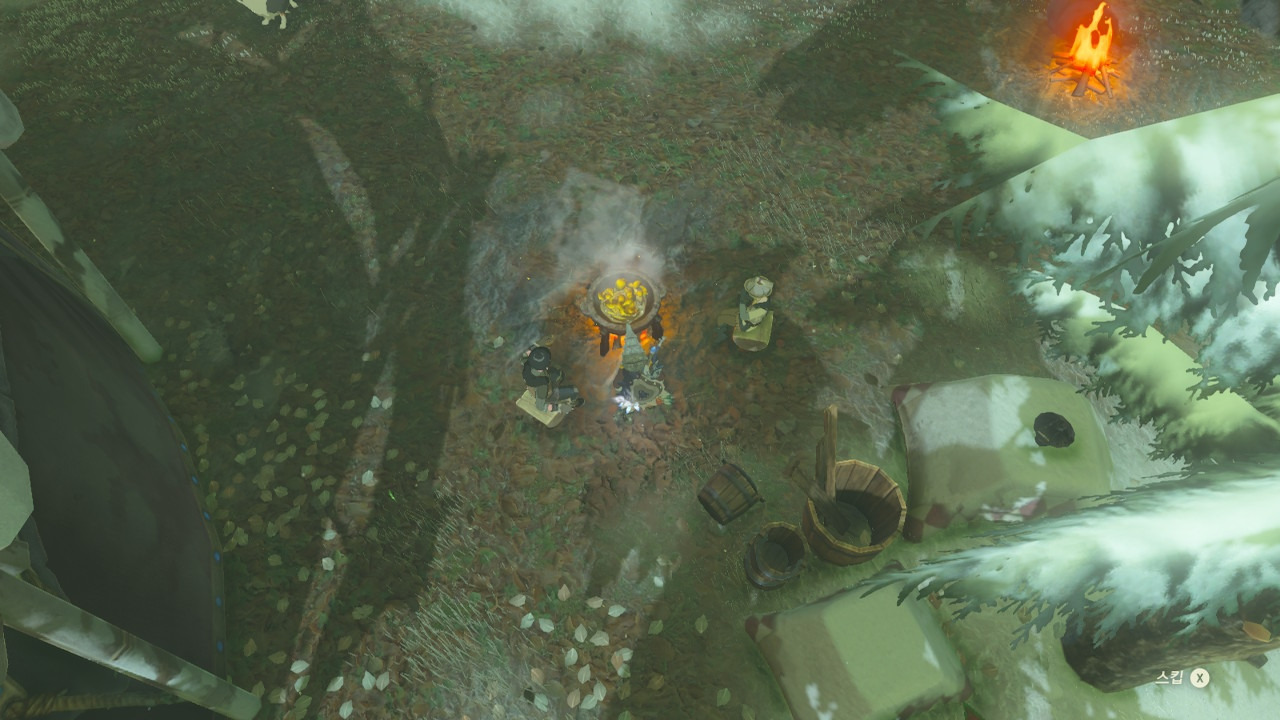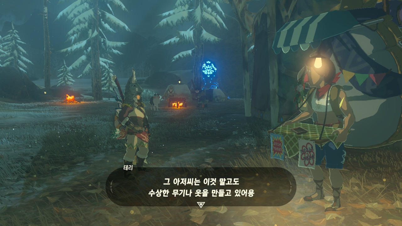 헤브라 산들은 정말 경사가 가팔랐다. 힘겹게 계곡 하나를 거슬러 올랐더니 날이 갰다. 얼마나 올라왔는지는 모르겠지만, 이어진 산길 사이 커다란 깃발이 나부끼고 있었다. 이전에 등산로의 집에서, 헤브라 산맥에 올랐다가 먹을 것이 없거나 구호물품이 필요할 경우에는 큰 깃발 아래를 찾아보라고 쓰여 있던 팁이 생각나 깃발을 향해 뛰어갔다. 깃발 아래에는 나무 드럼통, 장작 등이 놓여 있었는데... 상자도 있었다!