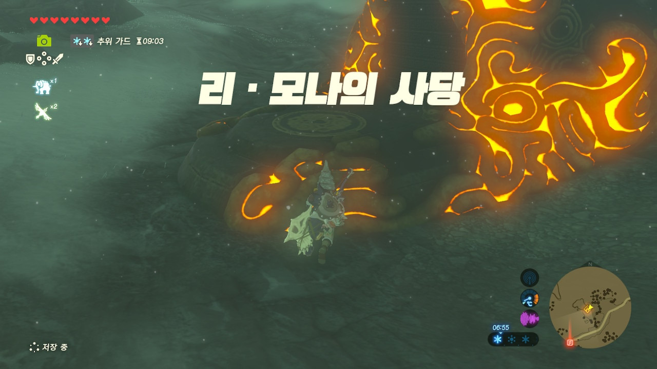 헤브라의 탑을 열고 패러세일로 내려오다가 사당을 하나 찾았는데, '리.모나의 사당'이란 곳이었다. 여기서는 작은 보주를 바람을 이용해 적절한 구멍에 집어넣는 미션이 있었다. 보주를 집어넣으면 도사에게로 가는 돌길이 튀어오르는데, 이 위에서 보주를 넣기 위한 약간의 퍼즐같은 문제를 풀어야 했다. 퍼즐 해결에 조금 시간이 걸리긴 했지만, 이 사당에서는 '고대의 코어'를 받을 수 있어서 정말 기분 좋았다. 가디언의 귀중한 부품은, 꽤 희소가치가 있으니까.