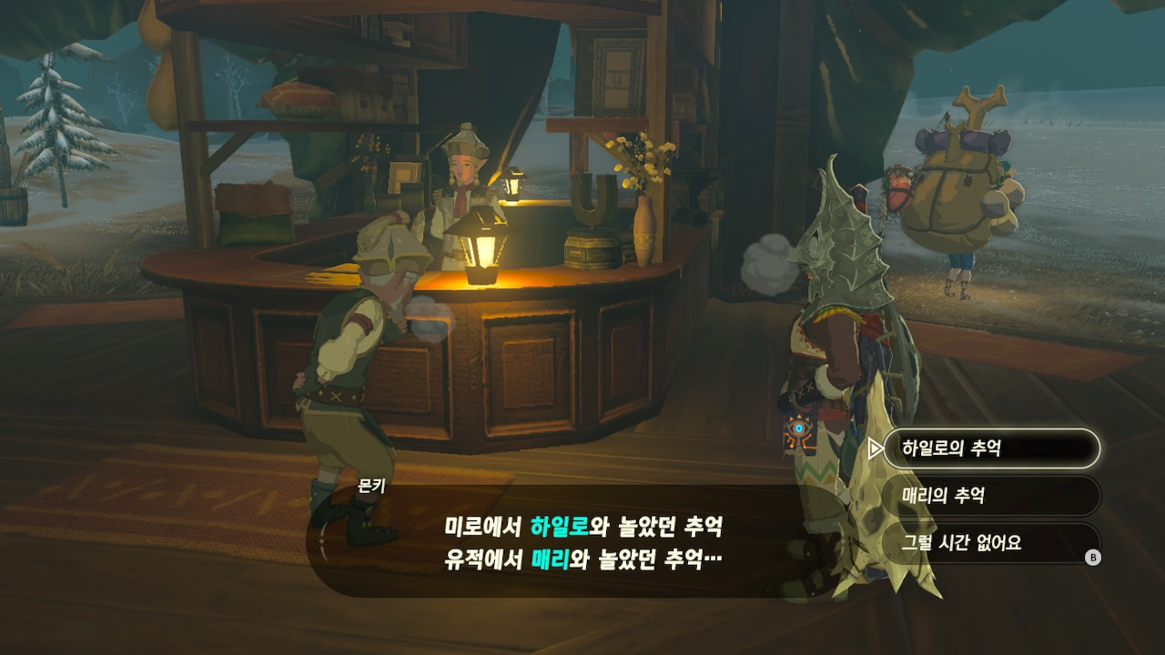 그는 미로에서 하일로와 놀았던 추억을 들을 건지, 유적에서 매리와 놀았던 추억에 대해 들을 건지를 고르라고 했다. 흠... 둘 다 듣기는 그렇고, 미로 이야기를 듣겠다고 선택했다.