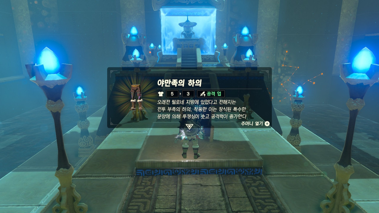 이 사당은 미궁을 돌파하는 자에게 주어진 축복을 전달해주는 곳이었다. 내가 받은 축복은, '야만족의 하의'라는 특수한 방어구를 얻은 것이었다. 필로네 지방에 있었다고 전해지는 전투 부족이 사용했던 것으로, 이 옷을 입으면 투쟁심과 공격력이 증가한다는 신비한 기능이 있었다.