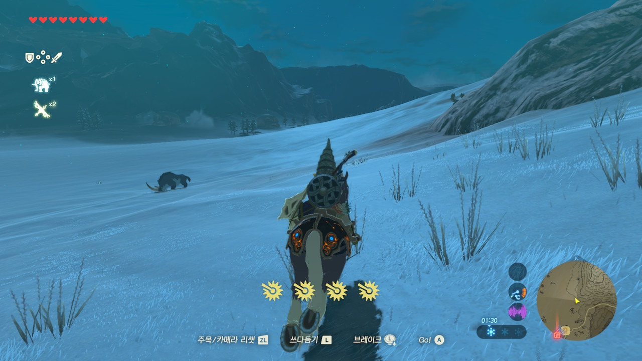 북타반타 설원까지는 한참 달려야 할 것 같아 오랜만에 마구간에서 나의 말인 '마린'을 찾은 후 타고 달렸다. 마린이 알아서 달려주는 부분이 있으니까 편한 부분도 있었다. 마린과 함께 눈이 덮인 평원 위를 달리니 춥고 을씨년스럽게만 보이던 눈길이 좀 다르게 보이는 마법이랄까... 말발굽 소리에 눈이 부서지고, 눈발이 날리며 달빛에 반짝거리는 걸 듣고 보는 기분도 썩 괜찮았다.
