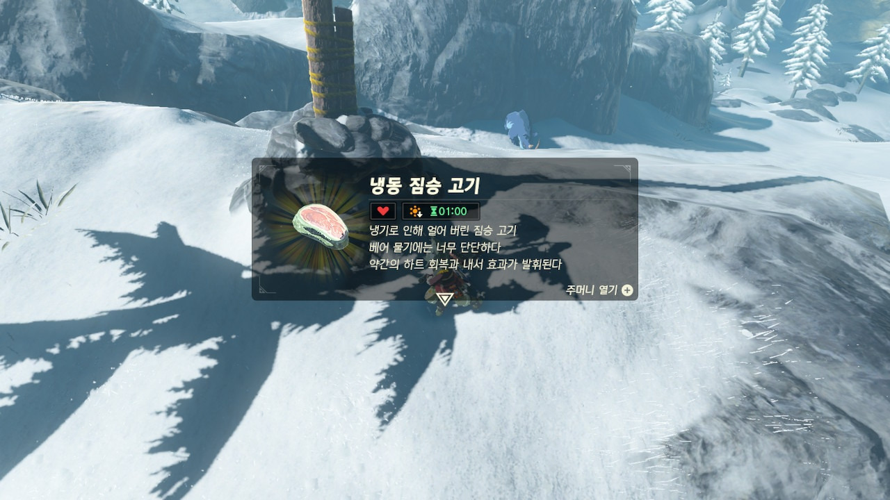 대단한 것이 있을 거라 기대는 안 했지만, 그래도 모르니까... 상자를 열었는데 의외의 음식이 들어있었다. 이름은 '냉동 짐승 고기'. 헤브라 지역이 너무 추워서 얼어붙어 버린 고기라고 한다. 그냥 먹기엔 무척 단단해서 먹기 쉽지 않을 것 같은데... 이것도 나름 요리라면 요리인 셈이지. 시커 스톤의 메모에 따르면, 더운 지방에서 먹기 좋다고 한다. 더운 지방... 갈 일이 있겠지?