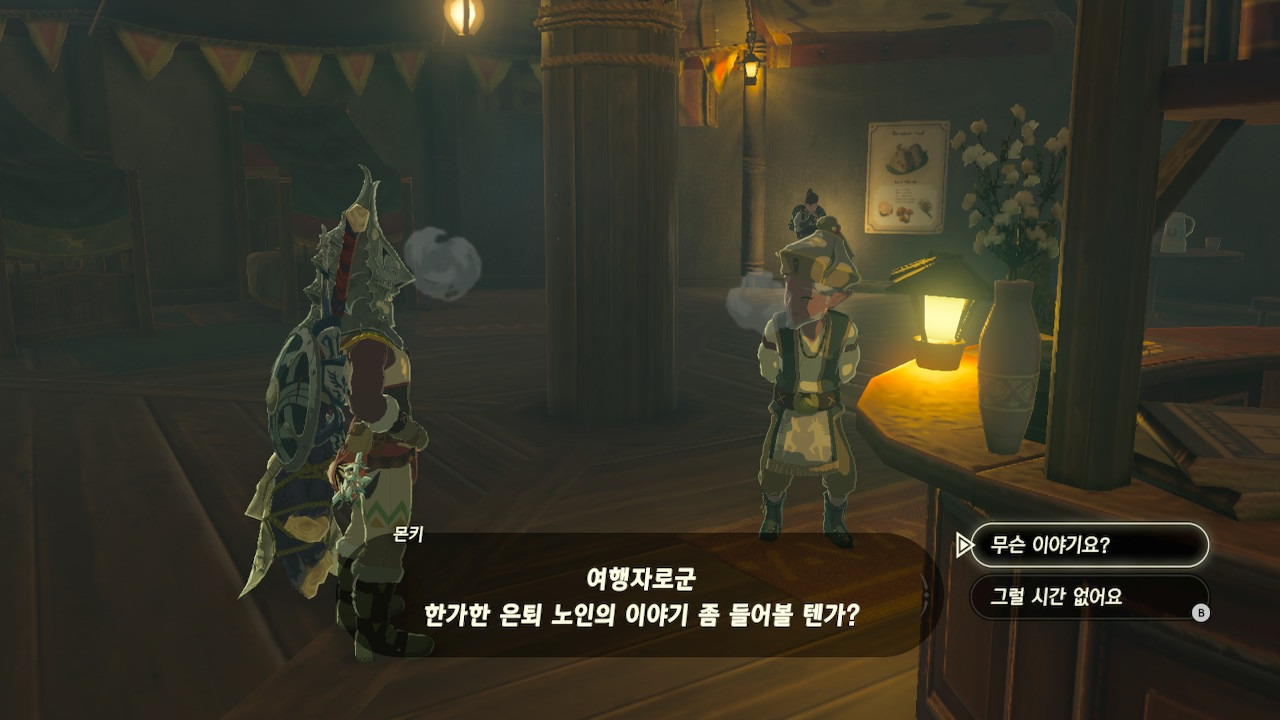 "여행자로군... 한가한 은퇴 노인의 이야기 좀 들어볼 텐가?"