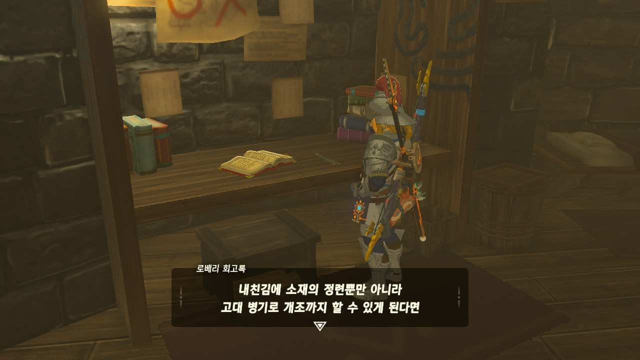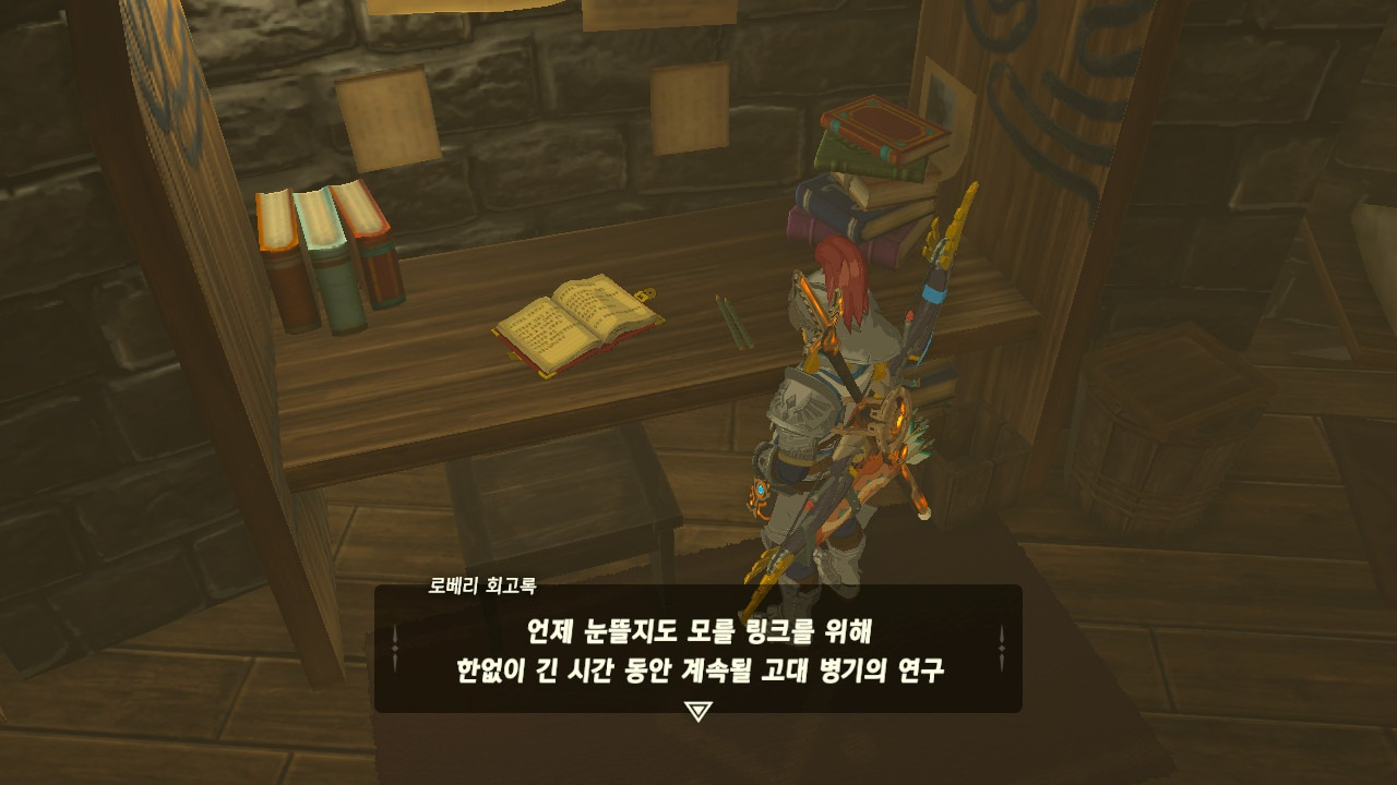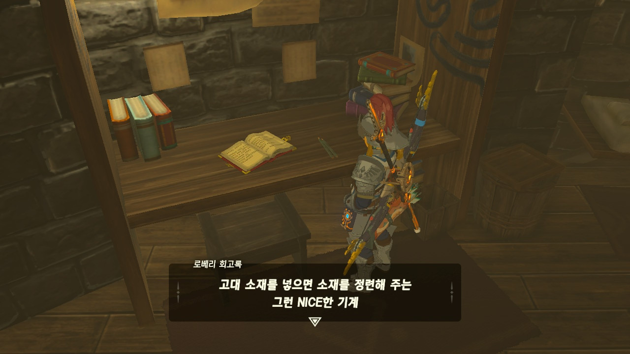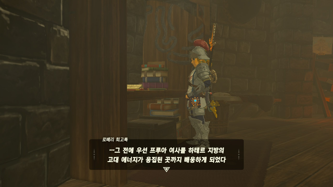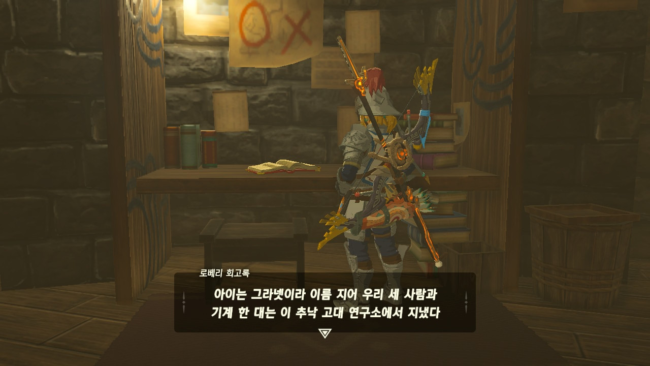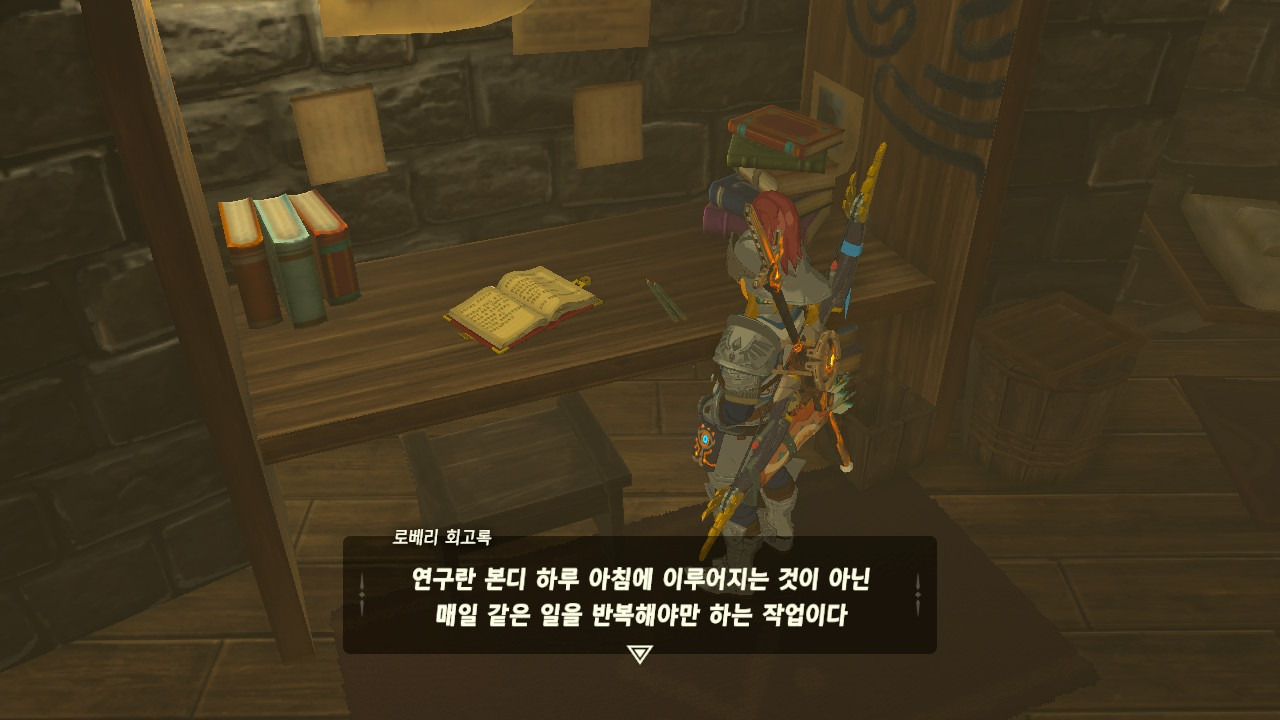 로베리에겐 이 추낙 연구소가 더 없이 소중한 장소가 되었다. 그 참담했던 재앙 가논의 역습 이후, 그는 가정을 꾸렸고 ... 사랑하는 아이도 무럭무럭 자랐고... 소중한 것을 더욱 지키고 싶었을 것 같은... 그래서 젤다 공주를 생각했을 것이고... 지금도, 재앙 가논의 토벌을 위해 나를 돕겠다고 하는 것이리라....