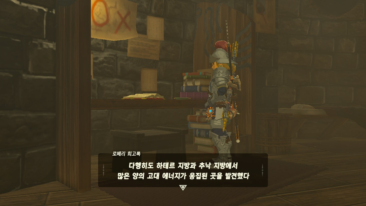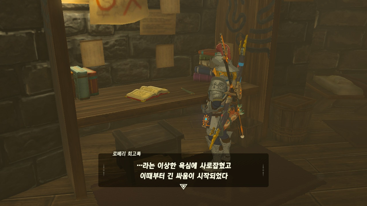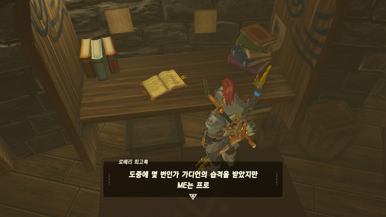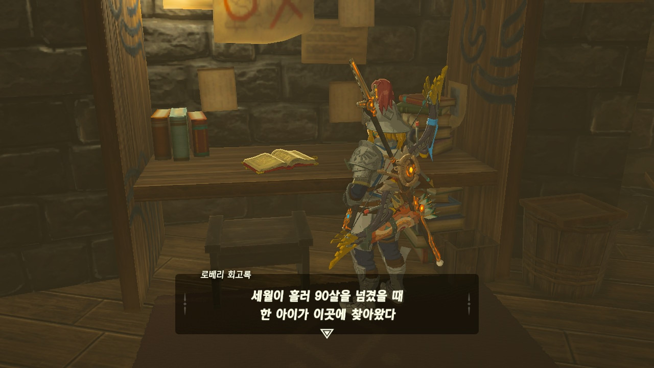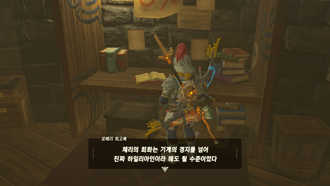 로베리에겐 이 추낙 연구소가 더 없이 소중한 장소가 되었다. 그 참담했던 재앙 가논의 역습 이후, 그는 가정을 꾸렸고 ... 사랑하는 아이도 무럭무럭 자랐고... 소중한 것을 더욱 지키고 싶었을 것 같은... 그래서 젤다 공주를 생각했을 것이고... 지금도, 재앙 가논의 토벌을 위해 나를 돕겠다고 하는 것이리라....