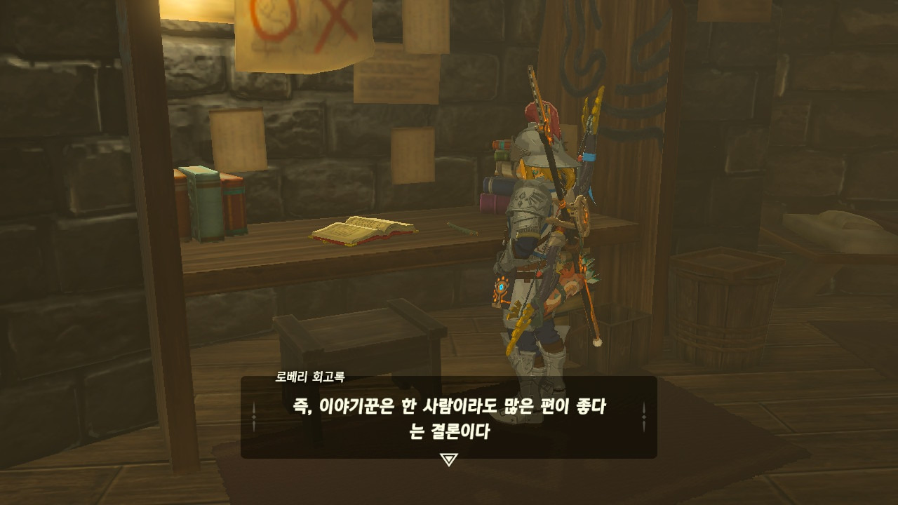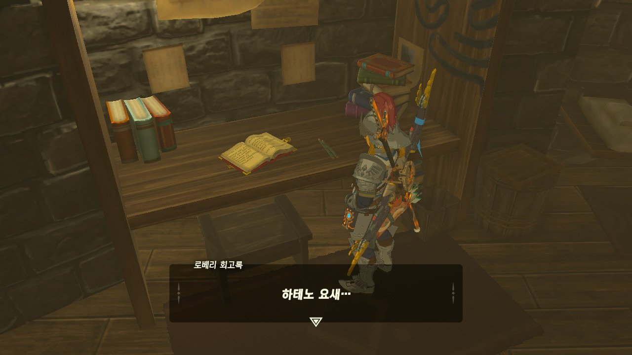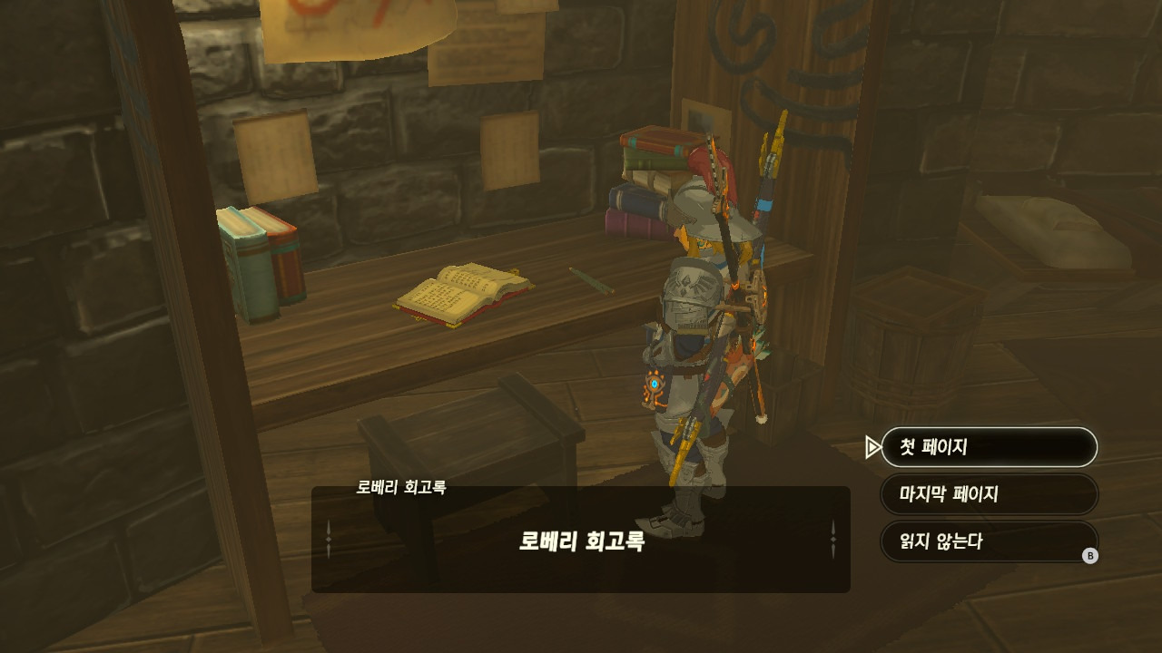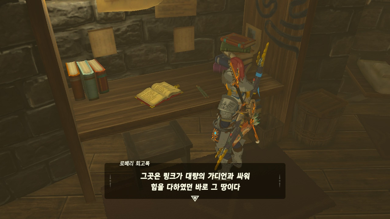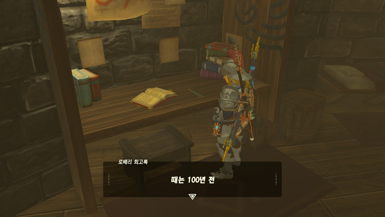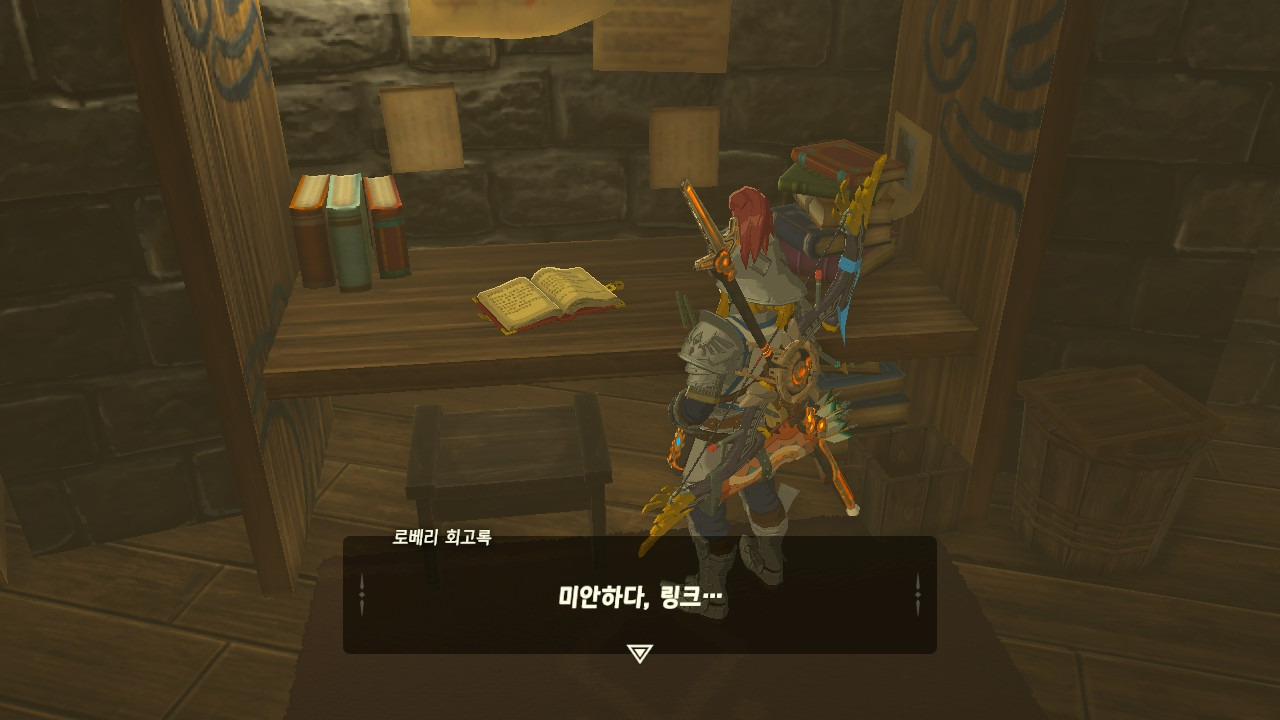 로베리에겐 이 추낙 연구소가 더 없이 소중한 장소가 되었다. 그 참담했던 재앙 가논의 역습 이후, 그는 가정을 꾸렸고 ... 사랑하는 아이도 무럭무럭 자랐고... 소중한 것을 더욱 지키고 싶었을 것 같은... 그래서 젤다 공주를 생각했을 것이고... 지금도, 재앙 가논의 토벌을 위해 나를 돕겠다고 하는 것이리라....