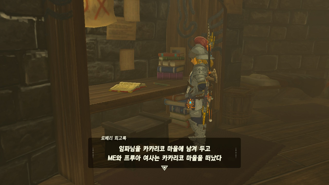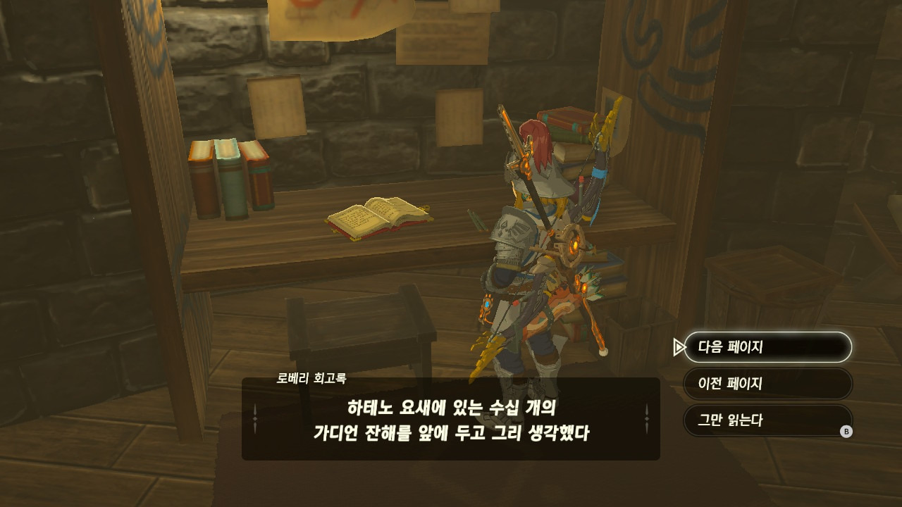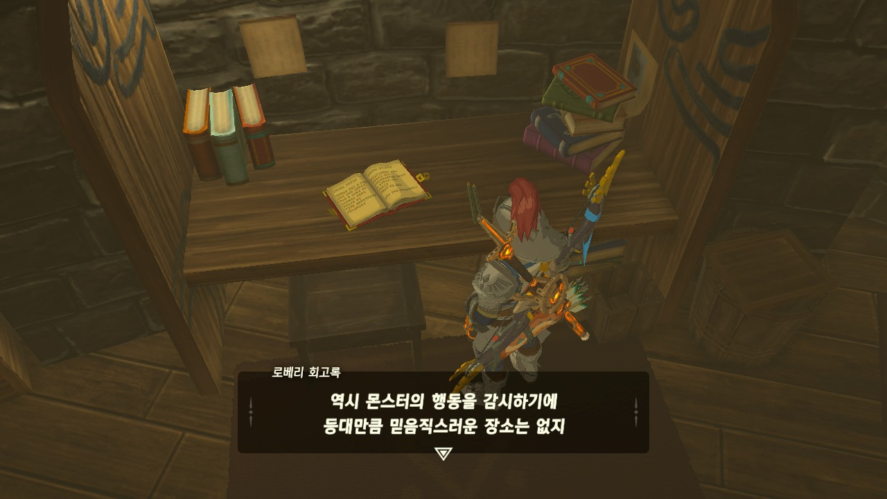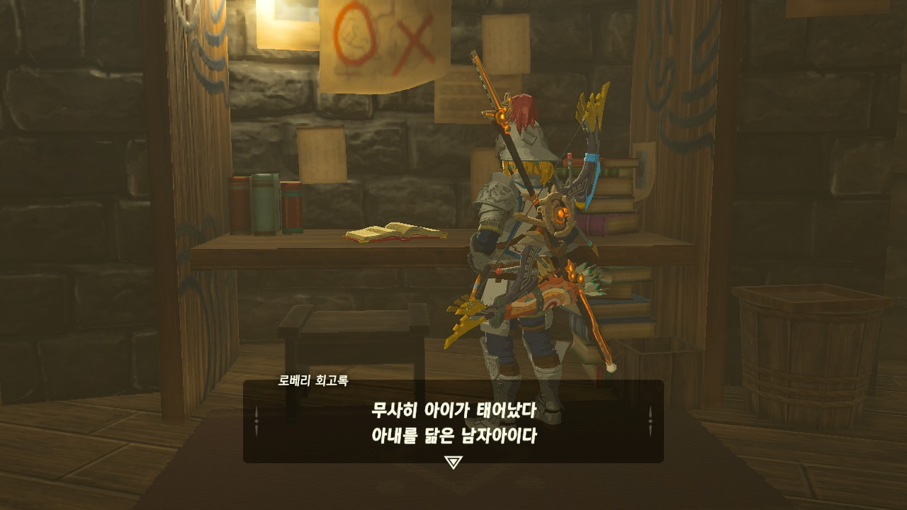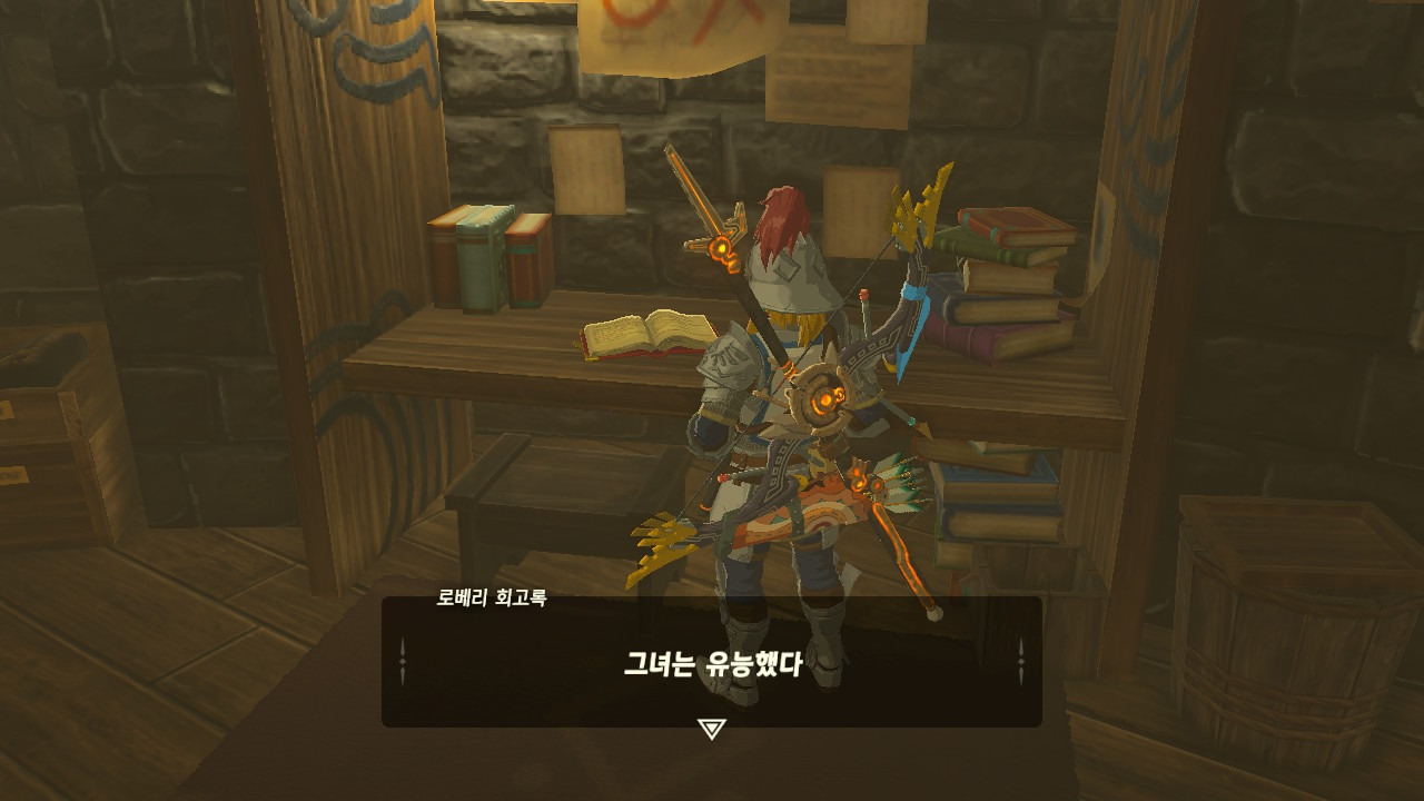 로베리에겐 이 추낙 연구소가 더 없이 소중한 장소가 되었다. 그 참담했던 재앙 가논의 역습 이후, 그는 가정을 꾸렸고 ... 사랑하는 아이도 무럭무럭 자랐고... 소중한 것을 더욱 지키고 싶었을 것 같은... 그래서 젤다 공주를 생각했을 것이고... 지금도, 재앙 가논의 토벌을 위해 나를 돕겠다고 하는 것이리라....