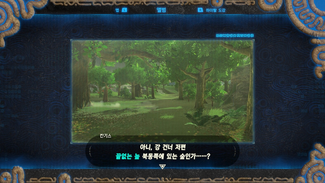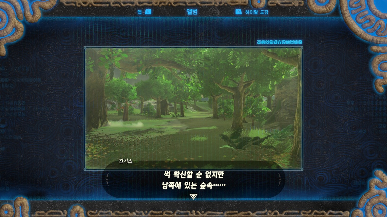 할아버지는 습원의 마구간에서 보이는 하이랄 성을 그리고 있었다. 나를 보며 반가워하는 할아버지는 내게 물어볼 장소가 있냐고 하기에 시커 스톤을 켰다. 시커 스톤에 나타난 그림은 너무 평범한 숲길이었다. 방금 내가 지나쳐 온 숲속 길과 다를 바가 없어 보이는데... 할아버지는 이 장소를 알 수 있을까?