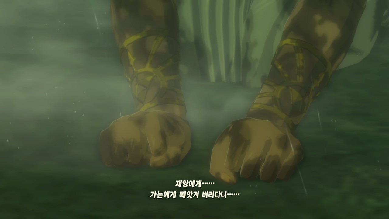 흐느끼던 젤다 공주에게 가까이 갔더니 그녀는 울음을 삼키다 지친 것 같았다. 그녀의 뺨을 타고 흘러내린 눈물은 비와 섞여 땅에 떨어졌다.