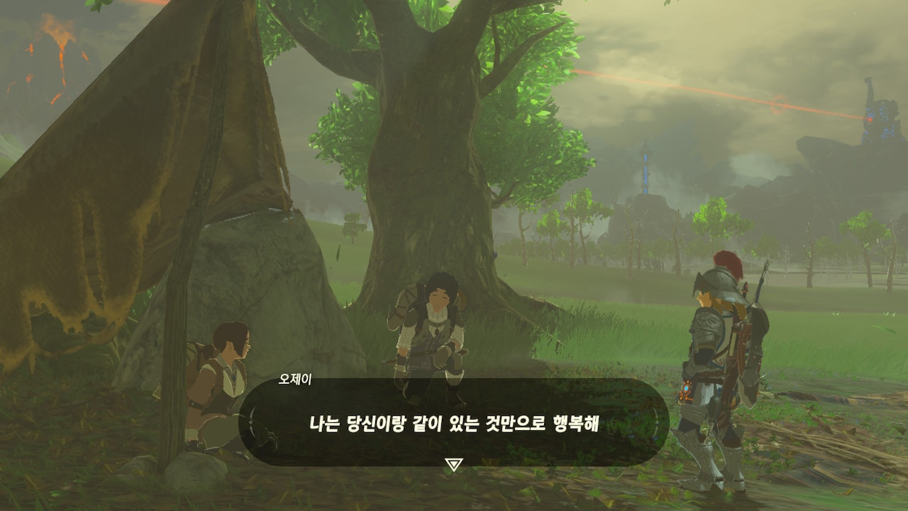 하이랄 왕국을 돌아다니다 보면, 잠시 숨이 멎을 것만 같은 아름다운 광경을 발견할 때가 있다. 그러나 그 광경을 보며 감탄하다가, 가끔은 한숨이 나왔었다. 당시엔 좋은 풍경을 보고 있는데 왜 기분이 좋지 않을까 갸우뚱하고 말았던 적이 있는데, 임터와 오제이를 보고 깨달았다. 내가 외로움을 느끼고 있었다는 걸... 두 사람은 그 아름다운 모습을 보는 것이 서로에게 더 좋은 추억이 되겠지만...