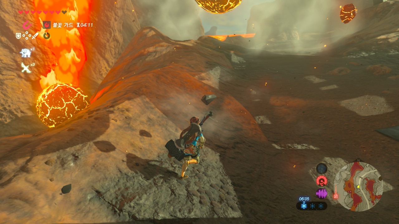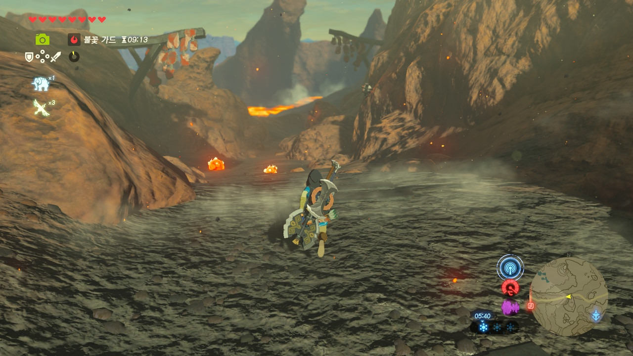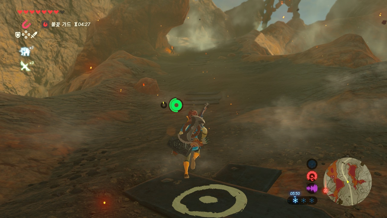 화상 주의라고? 안내된 길을 따라 계속 올라가는데, 지면이 엄청 뜨거워진다. 땅에서 올라오는 열기 자체가 아까와는 꽤 달랐다. 조금만 더 뜨거워지면 숨 쉬기 어려워 질 것 같다. 이동 속도를 조금 줄이고, 가지고 있는 츄츄젤리를 바닥에 놓고 쳐서 터뜨렸다. 물을 끼얹으니 조금 살 것 같다. 그런데, 그럼에도 불구하고 뜨거운 열기 때문에 움직이기 쉽지 않았다. 얼굴 피부에도 따끔따끔한 느낌이 있다.