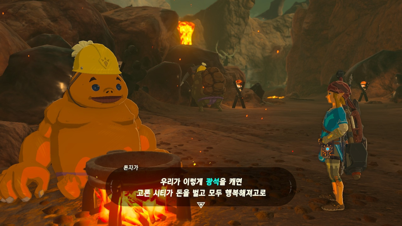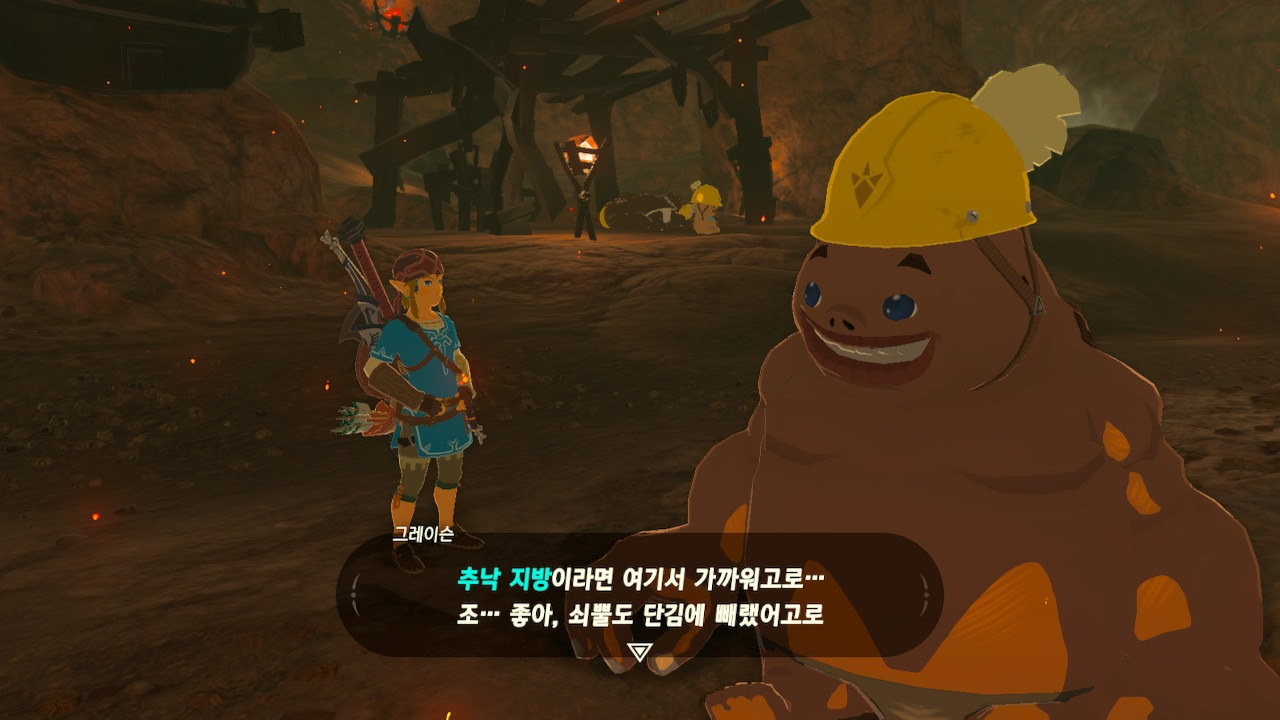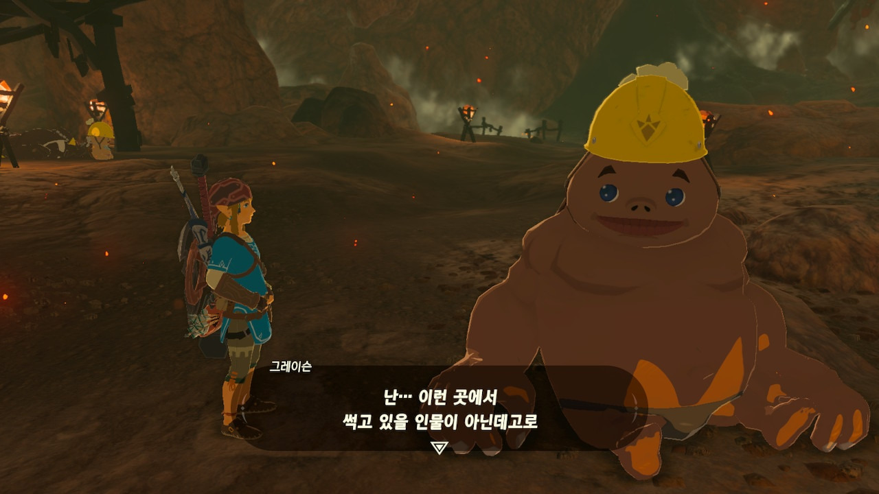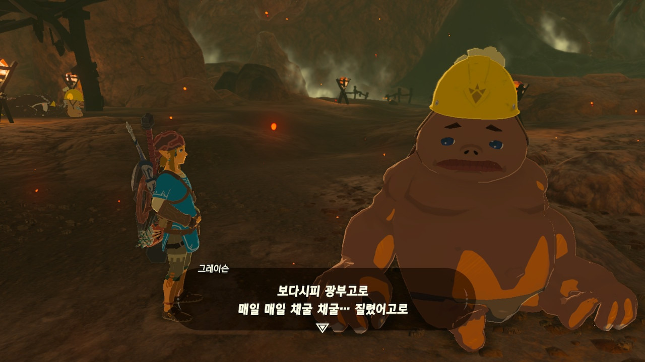 "... 하지만 지금은 데스마운틴 정상에 도마뱀 괴물이 눌러앉아 버려서 ... 원랜 산 정상 근처에서 더 좋은 광석을 캘 수 있는데... 여기서 채굴하고 있어고로."