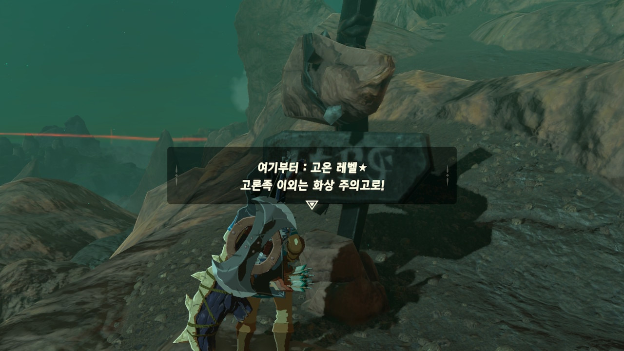 왠지 표지판이 반가워서 얼른 뛰어가 글씨를 읽어 보았다. 앞길은 데스마운틴 2부 능선이고, 고론 시티로 가는 길이라는 안내였다. 2부 능선이라... 그럼 이제 데스마운틴의 시작이라는 소리다. 그런데 여기서부터 고온 레벨이 '별표 하나' 라며, 고론족 이외는 화상 주의라는 말이 쓰여 있었다.