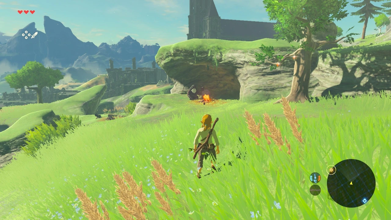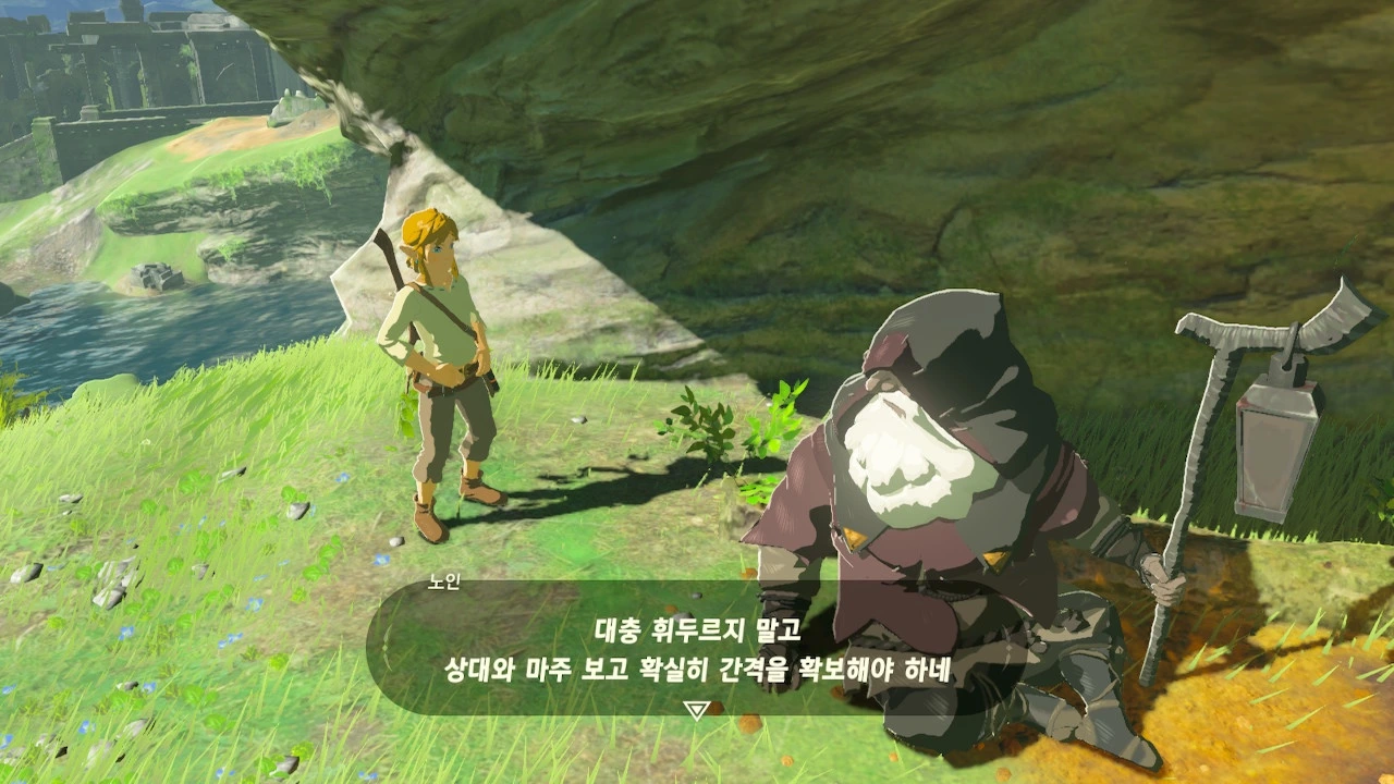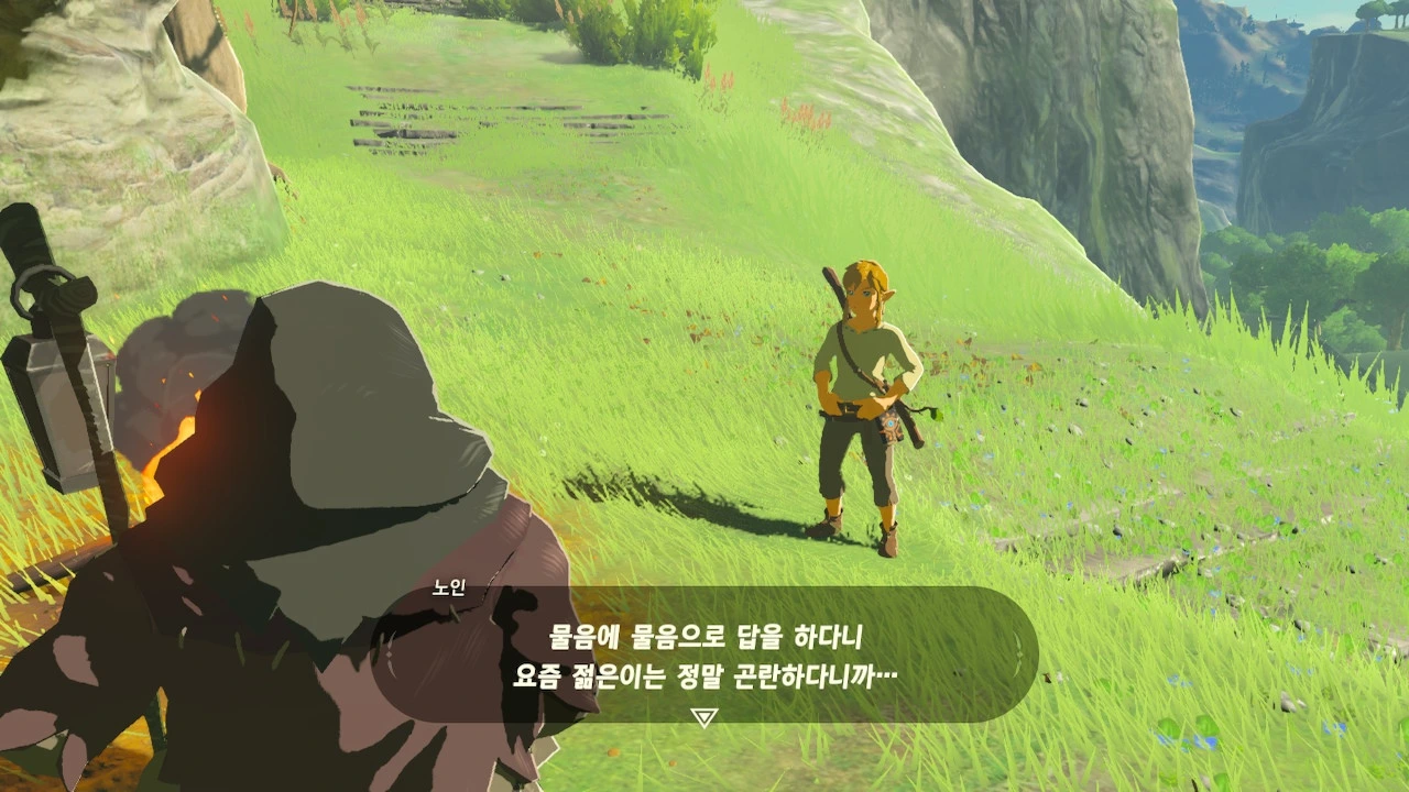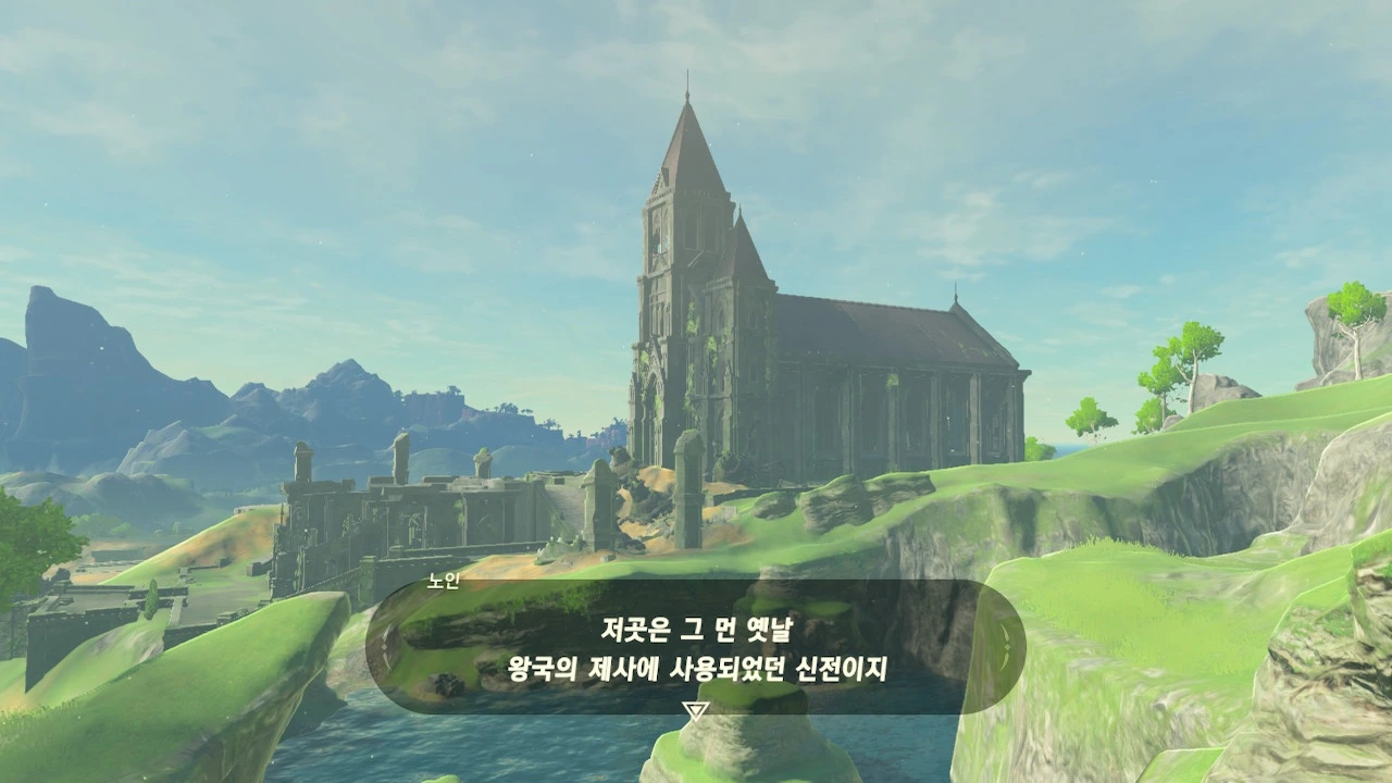 그는 나의 태도를 좋지 않게 보면서도 질문에는 충실히 대답해 주었다. 내가 있는 곳은 '시작의 대지'라 불리는 곳이며, 하이랄 왕국이 시작된 곳이라는 말도 덧붙였다. 그리고 멀리 보이는 저 오래된 건물은 왕국의 제사에 사용되었던 신전이라고 설명해 주었다. 나도 하이랄에서 살아온 사람이면 이 정도는 알 법도 같은데, 노인의 이야기는 처음 듣는 이야기였다.