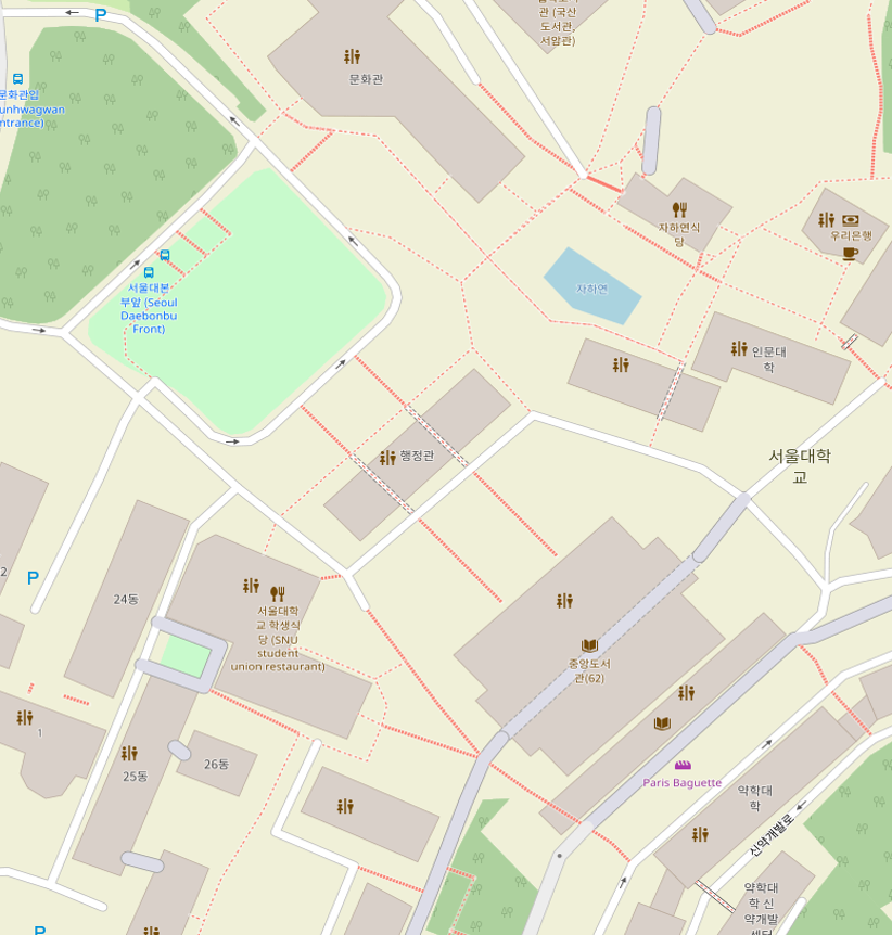 <OSM(서울대학교, 빨간색 점선 : GPS 궤적)>