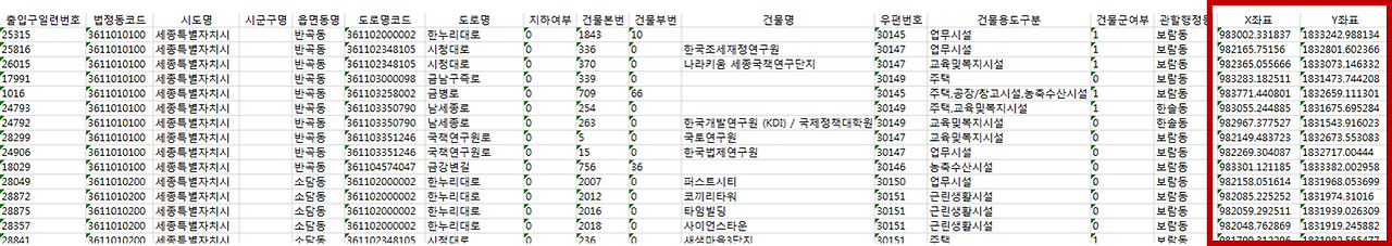 그래서 도로명주소안내시스템(개발자센터)에서 도로명주소와 주된 출입구의 좌표 정보를 제공하는 위치정보요약DB를 다운로드했다. 해당 DB에는 시도명, 시군구명, 읍면동명, 도로명코드, 도로명, 건물번호, 건물명, 우편번호 등과 X ·Y좌표(GRS80 타원체 UTM-K 좌표계)가 포함되어 있다.